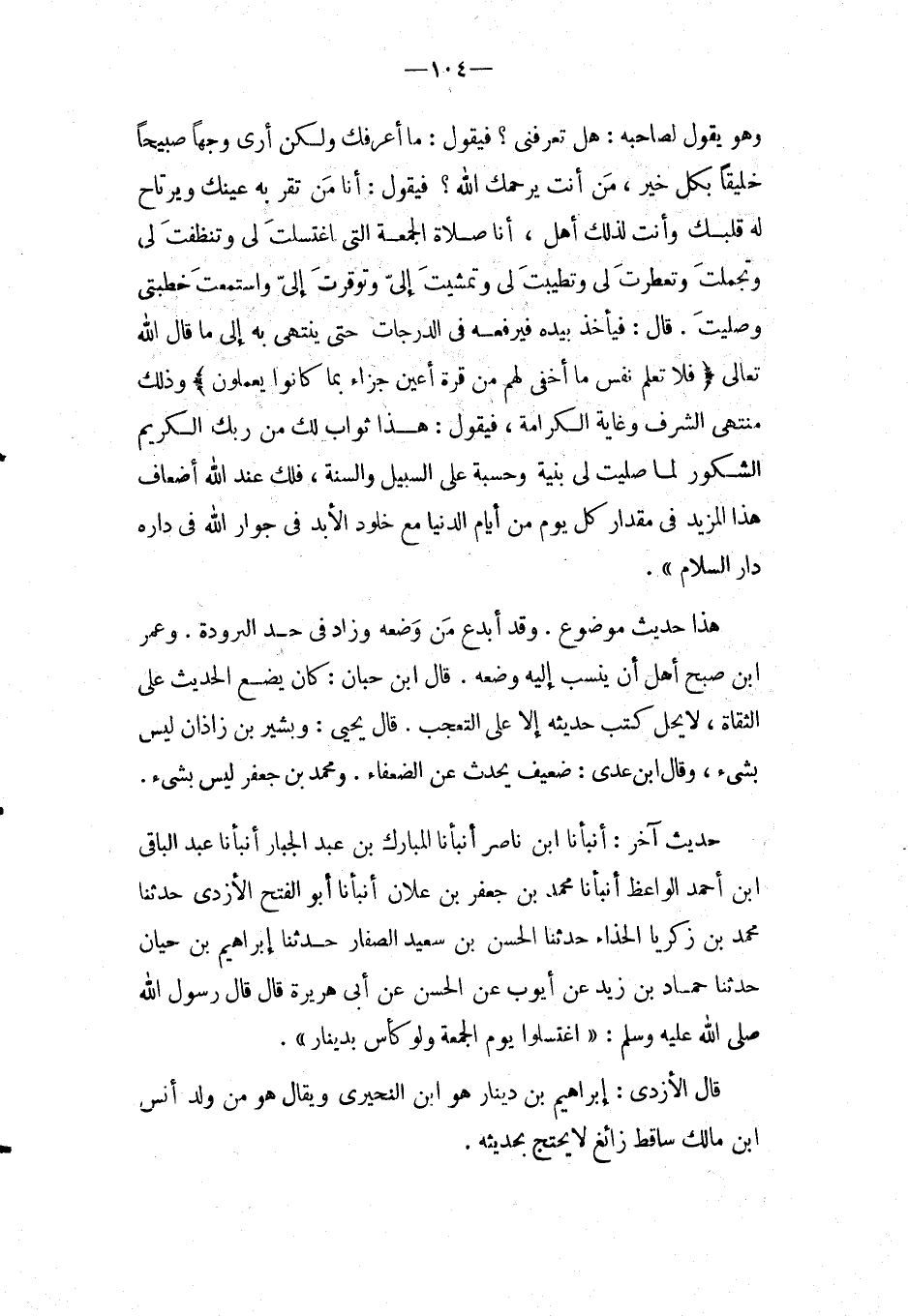 حَدِيث آخر: أَنْبَأَنَا ابْنُ نَاصِرٍ أَنْبَأَنَا الْمُبَارَكُ بْنُ عَبْدِ الْجَبَّارِ أَنبأَنَا عبد الْبَاقِي ابْن أَحْمَدَ الْوَاعِظُ أَنْبَأَنَا مُحَمَّدُ بْنُ جَعْفَرِ بْنِ عَلانَ أَنْبَأَنَا أَبُو الْفَتْحِ الأَزْدِيُّ حَدَّثَنَا مُحَمَّدُ بْنُ زَكَرِيَّا الْحَذَّاءُ حَدَّثَنَا الْحَسَنُ بْنُ سَعِيدٍ الصَّفَّارُ حَدَّثَنَا إِبْرَاهِيمُ بْنُ حَيَّانَ حَدَّثَنَا حَمَّادُ بْنُ زَيْدٍ عَنْ أَيُّوبَ عَنِ الْحَسَنِ عَنْ أَبِي هُرَيْرَةَ قَالَ قَالَ رَسُولُ الله صَلَّى اللَّهُ عَلَيْهِ وَسَلَّمَ: " اغْتَسِلُوا يَوْمَ الْجُمُعَةِ وَلَوْ كَأْسٌ بِدِينَارٍ ".