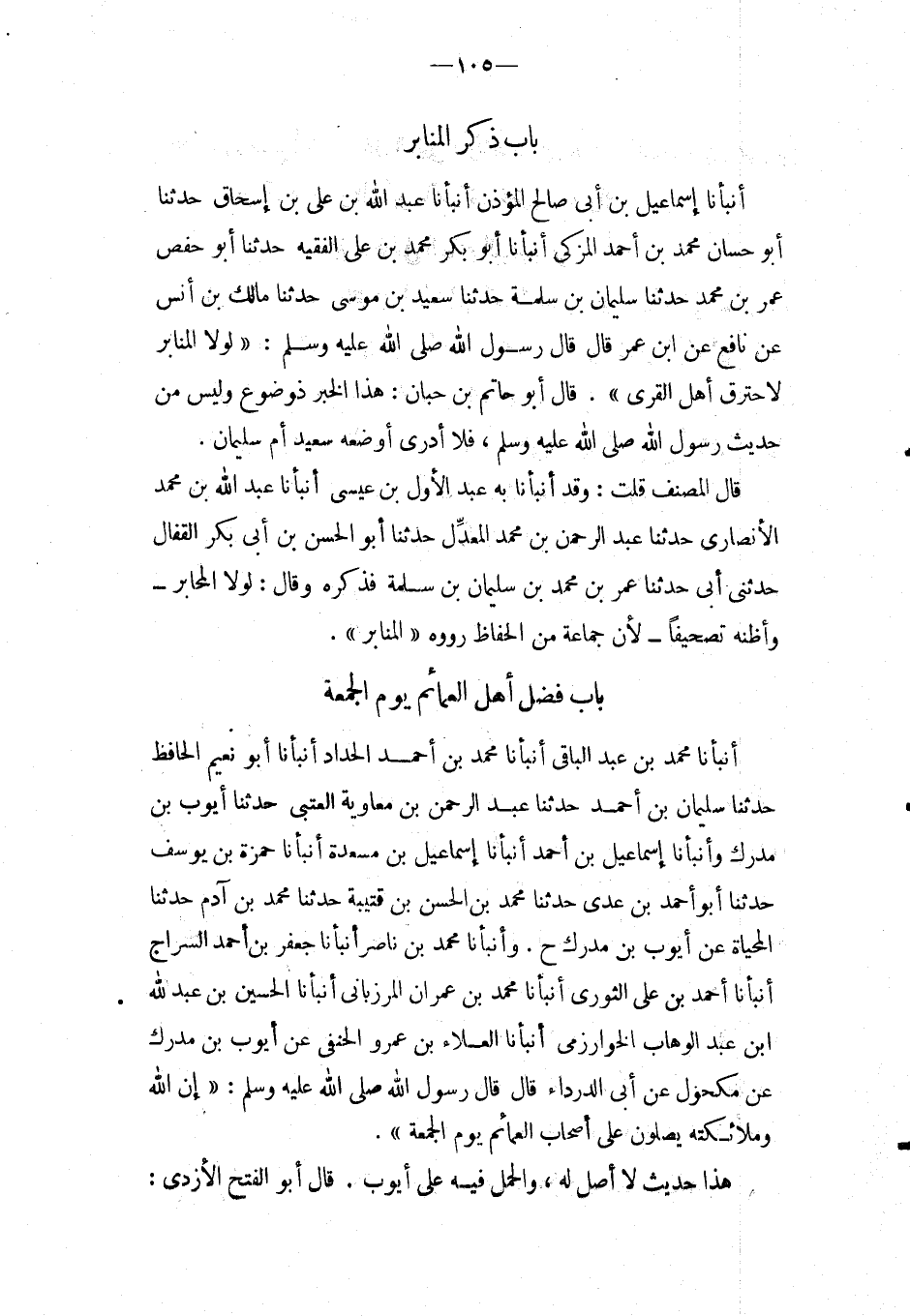 بَاب ذكر المنابر أَنْبَأَنَا إِسْمَاعِيلُ بْنُ أَبِي صَالِحٍ الْمُؤَذّن أَنبأَنَا عبد الله بْنُ عَلِيِّ بْنِ إِسْحَاقَ حَدَّثَنَا أَبُو حَسَّانٍ مُحَمَّدُ بْنُ أَحْمَدَ الْمُزَكِّيُّ أَنْبَأَنَا أَبُو بَكْرٍ مُحَمَّدُ بْنُ عَلِيٍّ الْفَقِيهُ حَدَّثَنَا أَبُو حَفْصٍ عُمَرُ بْنُ مُحَمَّدٍ حَدَّثَنَا سُلَيْمَانُ بْنُ سَلَمَةَ حَدَّثَنَا سَعِيدُ بْنُ مُوسَى حَدَّثَنَا مَالِكُ بْنُ أَنَسٍ عَنْ نَافِع عَنِ ابْنِ عُمَرَ قَالَ قَالَ رَسُولُ اللَّهِ صَلَّى اللَّهُ عَلَيْهِ وَسَلَّمَ: " لَوْلا الْمَنَابِرُ لاحْتَرَقَ أَهْلُ الْقُرَى " قَالَ أَبُو حَاتِمِ بْنُ حِبَّانَ: هَذَا الْخَبَر ذُو ضوع وَلَيْسَ مِنْ حَدِيثِ رَسُولِ اللَّهِ صَلَّى اللَّهُ عَلَيْهِ وَسَلَّمَ، فَلَا أَدْرِي أَوَضَعَهُ سَعِيدٌ أَمْ سُلَيْمَانُ.