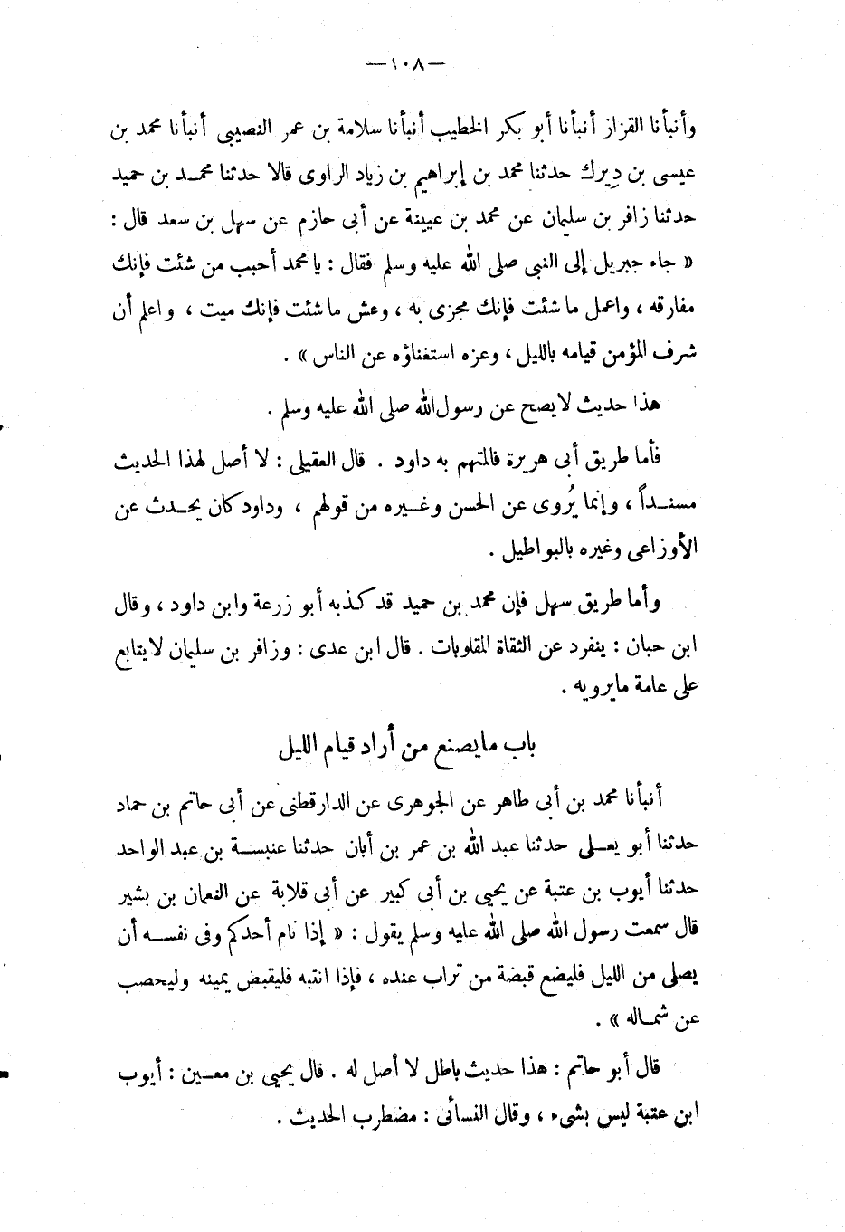 بَاب مَا يصنع من أَرَادَ قيام اللَّيْل أَنْبَأَنَا مُحَمَّدُ بْنُ أَبِي طَاهِرٍ عَنِ الْجَوْهَرِيِّ عَنِ الدَّارَقُطْنِيِّ عَنْ أَبِي حَاتِمِ بْنِ حَمَّادٍ