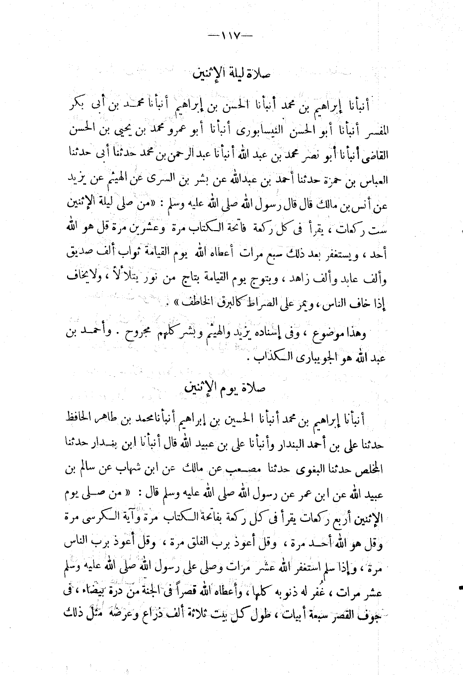 صَلَاة يَوْم الِاثْنَيْنِ أَنبأَنَا إِبْرَاهِيمُ بْنُ مُحَمَّدٍ أَنْبَأَنَا الْحُسَيْنُ بْنِ إِبْرَاهِيمَ أَنْبَأَنَا مُحَمَّدُ بْنُ طَاهِرٍ الْحَافِظُ حَدَّثَنَا عَلِيُّ بْنُ أَحْمَدَ الْبُنْدَارُ وَأَنْبَأَنَا عَلِيُّ بْنُ عبيد الله قَالَ أَنْبَأَنَا ابْنُ بُنْدَارٍ حَدَّثَنَا الْمُخَلِّصُ حَدَّثَنَا الْبَغَوِيُّ حَدَّثَنَا مُصْعَبٌ عَنْ مَالِكٍ عَنِ ابْنِ شِهَابٍ عَن سَالم بن عبيد الله عَن ابْن عمر عَن رَسُول الله صَلَّى اللَّهُ عَلَيْهِ وَسَلَّمَ قَالَ: " مَنْ صَلَّى يَوْمَ الاثْنَيْنِ أَرْبَعَ رَكْعَاتٍ يَقْرَأُ فِي كُلِّ رَكْعَةٍ بِفَاتِحَةِ الْكِتَابِ مَرَّةً وَآيَة الْكُرْسِيّ مرّة وَقل هُوَ الله أحد مرّة، وَقل أعوذ بِرَبّ الفلق مرّة، وَقل أَعُوذُ بِرَبِّ النَّاسِ مَرَّةً، وَإِذَا سَلَّمَ اسْتَغْفَرَ اللَّهَ عَشْرَ مَرَّاتٍ وَصَلَّى عَلَى رَسُولِ اللَّهِ صَلَّى اللَّهُ عَلَيْهِ وَسَلَّمَ عَشْرَ مَرَّاتٍ، غُفِرَ لَهُ ذُنُوبُهُ كُلُّهَا، وَأَعْطَاهُ اللَّهُ قَصْرًا فِي الْجَنَّةِ مِنْ دُرَّةٍ بَيْضَاءَ، فِي جَوْفِ الْقَصْرِ سَبْعَةُ أَبْيَاتٍ، طُولُ كُلِّ بَيْتٍ ثَلَاثَة ألف ذِرَاع وَعرضه مثل ذَلِك