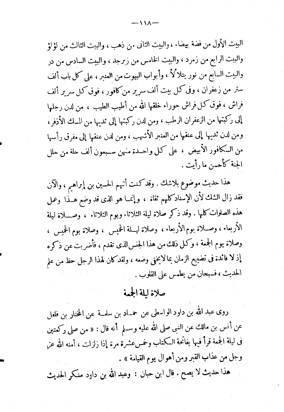 وَقَدْ ذكر صَلَاة لَيْلَة الثُّلَاثَاء وَيَوْم الثُّلَاثَاء، وَصَلَاة لَيْلَة الْأَرْبَعَاء، وَصَلَاة يَوْم الْأَرْبَعَاء، وَصَلَاة لَيْلَة الْخَمِيس، وَصَلَاة يَوْم الْخَمِيس، وَصَلَاة يَوْم الْجُمُعَةِ، وكل ذَلِكَ من هَذَا الْجِنْس الَّذِي تقدم، فأضربت عَنْ ذكره إِذْ لَا فَائِدَة فِي تَضْييع الزَّمَان بِمَا لَا يخفى وَضعه، وَلَقَد كَانَ لهَذَا الرجل حَظّ من علم الحَدِيث، فسبحان من يطمس على الْقُلُوب.