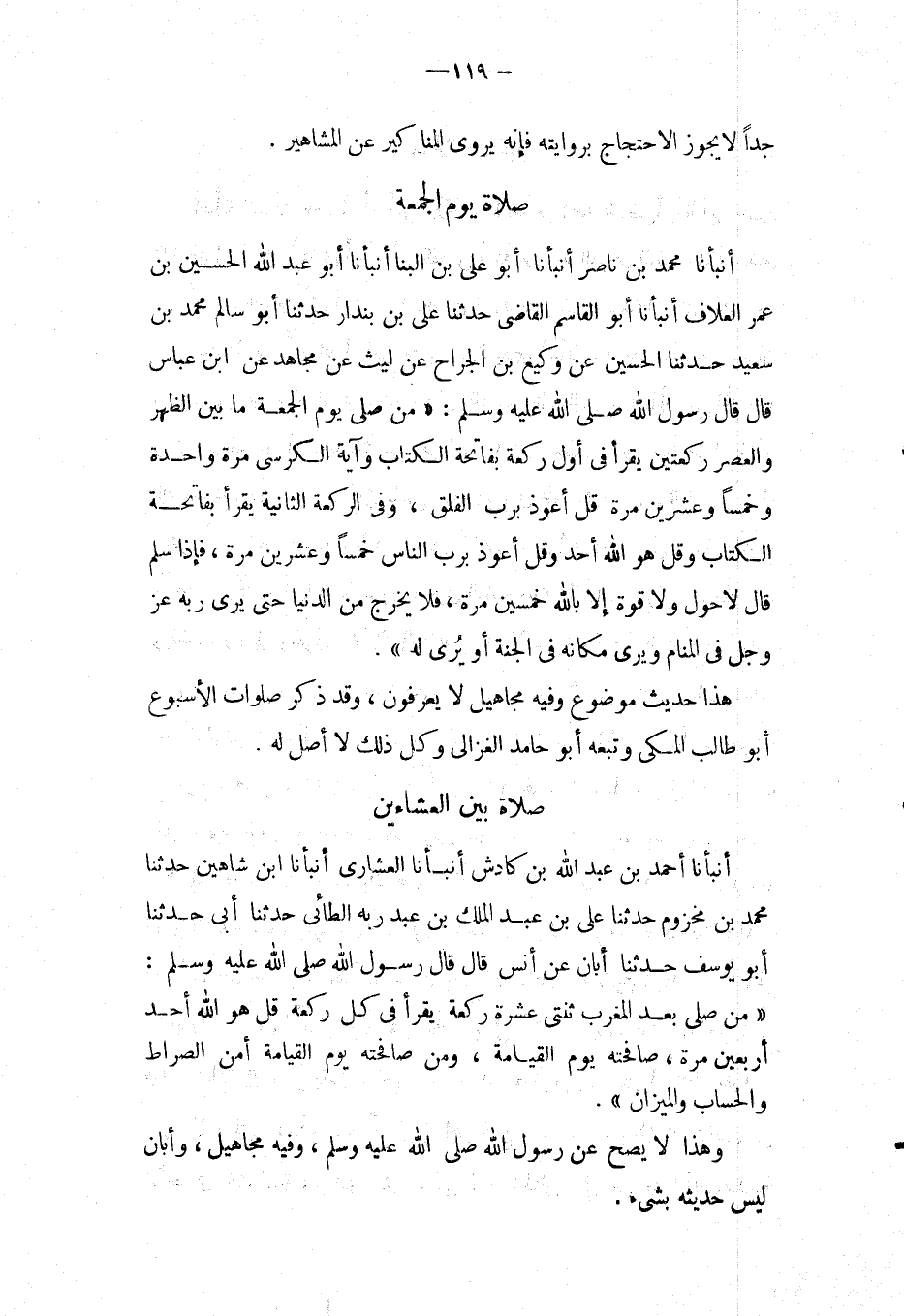 عُمَرَ الْعَلافُ أَنْبَأَنَا أَبُو الْقَاسِمِ الْقَاضِي حَدَّثَنَا عَلِيُّ بْنُ بُنْدَارٍ حَدَّثَنَا أَبُو سَالِمٍ مُحَمَّدُ بْنُ سَعِيدٍ حَدَّثَنَا الْحُسَيْن عَنْ وَكِيعِ بْنِ الْجَرَّاحِ عَنْ لَيْثٍ عَنْ مُجَاهِدٍ عَنِ ابْنِ عَبَّاسٍ قَالَ قَالَ رَسُول الله صَلَّى اللَّهُ عَلَيْهِ وَسَلَّمَ: " مَنْ صَلَّى يَوْمَ الْجُمُعَةِ مَا بَيْنَ الظُّهْرِ وَالْعَصْرِ رَكْعَتَيْنِ يَقْرَأُ فِي أَوَّلِ رَكْعَةٍ بِفَاتِحَةِ الْكِتَابِ وَآيَةِ الْكُرْسِيِّ مَرَّةً وَاحِدَةً وَخَمْسًا وَعِشْرِينَ مَرَّةً قُلْ أَعُوذُ بِرَبِّ الْفَلَقِ، وَفِي الرَّكْعَةِ الثَّانِيَة يقْرَأ بِفَاتِحَة الْكتاب وَقل هُوَ الله أحد وَقل أَعُوذُ بِرَبِّ النَّاسِ خَمْسًا وَعِشْرِينَ مَرَّةً، فَإِذَا سَلَّمَ قَالَ لَا حَوَل وَلا قُوَّةَ إِلا بِاللَّهِ خَمْسِينَ مَرَّةً، فَلا يَخْرُجُ مِنَ الدُّنْيَا حَتَّى يَرَى رَبَّهُ عَزَّ وَجَلَّ فِي الْمَنَامِ وَيَرَى مَكَانَهُ فِي الْجَنَّةِ أَوْ يُرَى لَهُ ".