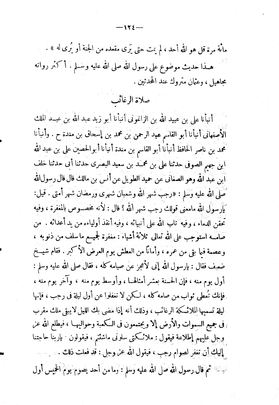 صَلَاة الرغائب أَنبأَنَا على بن عبيد الله بْنِ الزَّاغُونِيُّ أَنْبَأَنَا أَبُو زَيْدٍ عبد الله بْنُ عَبْدِ الْمَلِكِ الأَصْفَهَانِيُّ أَنْبَأَنَا أَبُو الْقَاسِم عبد الرحمن بْنُ مُحَمَّدِ بْنِ إِسْحَاقَ بْنِ مَنْدَهْ ح.