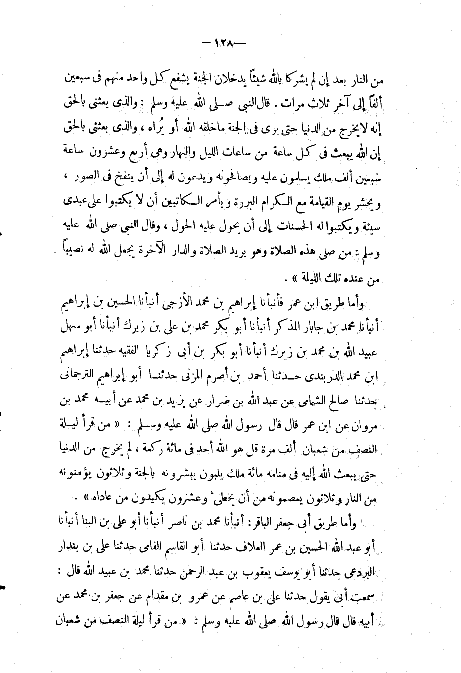 وَأما طَرِيق ابْن عمر فأنبأنا إِبْرَاهِيمُ بْنُ مُحَمَّدٍ الأَزَجِيُّ أَنْبَأَنَا الْحُسَيْنُ بْنُ إِبْرَاهِيمَ أَنْبَأَنَا مُحَمَّدُ بْنُ جَابَارٍ الْمُذَكِّرُ أَنْبَأَنَا أَبُو بَكْرٍ مُحَمَّدُ بْنُ عَلِيِّ بْنِ زيرك أَنبأَنَا أَبُو سهل عبيد الله بْنُ مُحَمَّدِ بْنِ زِيرَكَ أَنْبَأَنَا أَبُو بَكْرِ بْنُ أَبِي زَكَرِيَّا الْفَقِيه حَدثنَا إِبْرَاهِيم ابْن مُحَمَّدٍ الدَّرَبَنْدِيُّ حَدَّثَنَا أَحْمَدُ بْنُ أَصْرَمَ الْمُزَنِيُّ حَدَّثَنَا أَبُو إِبْرَاهِيم الترجمانى حَدثنَا صَالح الشمامى عَن عبد الله بْنِ ضِرَارٍ عَنْ يَزِيدَ بْنِ مُحَمَّدٍ عَنْ أَبِيهِ مُحَمَّدِ بْنِ مَرْوَانَ عَنِ ابْنِ عُمَرَ قَالَ قَالَ رَسُول الله صَلَّى اللَّهُ عَلَيْهِ وَسَلَّمَ: " مَنْ قَرَأَ لَيْلَةَ النِّصْفِ مِنْ شَعْبَانَ أَلْفَ مَرَّةٍ قُلْ هُوَ اللَّهُ أَحَدٌ فِي مِائَةِ رَكْعَةٍ، لَمْ يَخْرُجْ مِنَ الدُّنْيَا