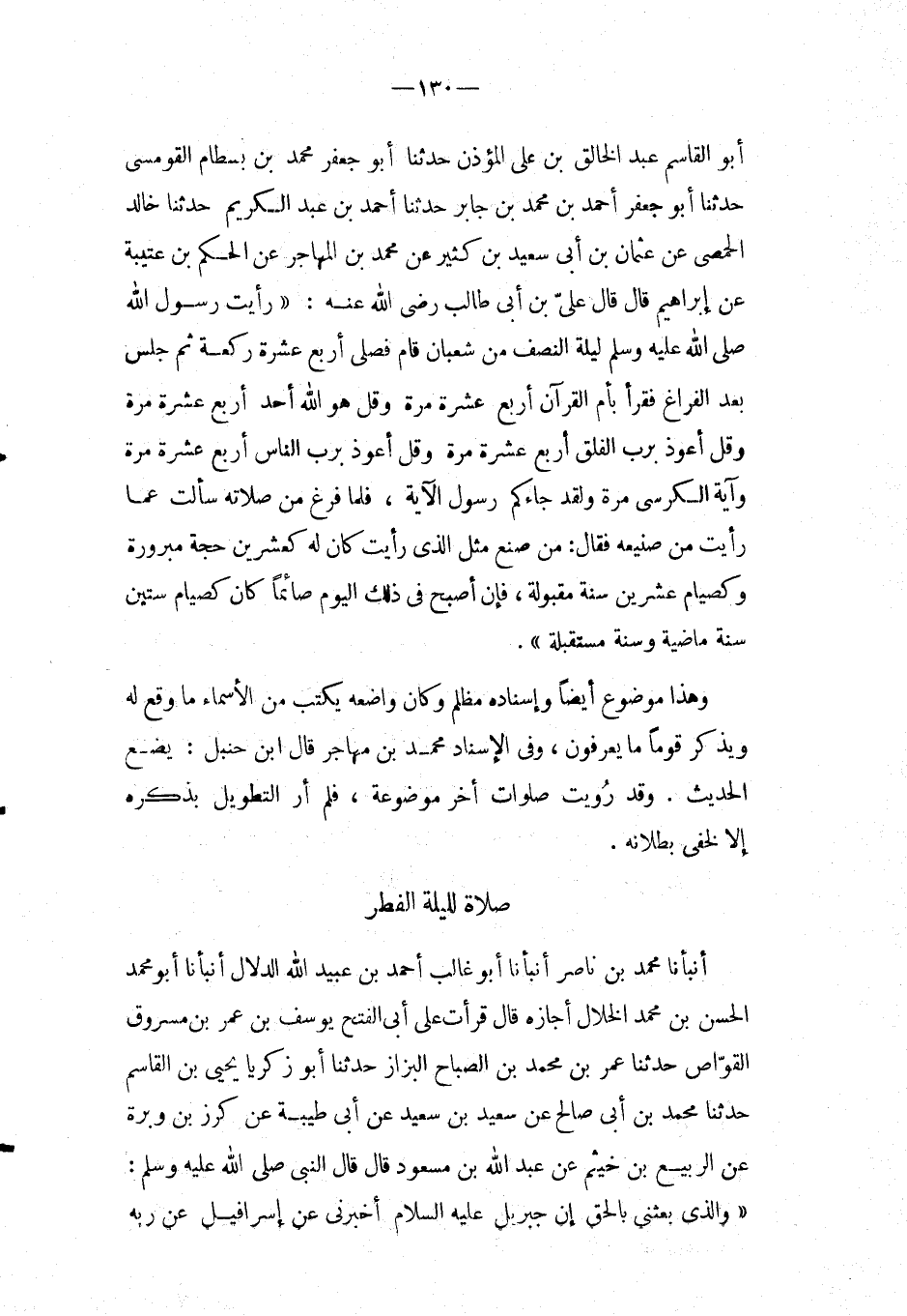 أَبُو الْقَاسِمِ عَبْدُ الْخَالِقِ بْنُ عَلِيٍّ الْمُؤَذِّنُ حَدَّثَنَا أَبُو جَعْفَرٍ مُحَمَّدُ بْنُ بِسْطَامَ الْقُومَسِيُّ حَدَّثَنَا أَبُو جَعْفَرٍ أَحْمَدُ بْنُ مُحَمَّدِ بْنِ جَابِرٍ حَدَّثَنَا أَحْمَدُ بْنُ عَبْدِ الْكَرِيمِ حَدَّثَنَا خَالِدٌ الْحِمْصِيُّ عَنْ عُثْمَانَ بْنِ أَبِي سَعِيدِ بْنِ كَثِيرٍ عَنْ مُحَمَّدِ بْنِ الْمُهَاجِرِ عَنِ الْحَكَمِ بْنِ عُتَيْبَةَ عَنْ إِبْرَاهِيمَ قَالَ قَالَ عَلِيُّ بن أبي طَالب رَضِي الله عَنْهُ: " رَأَيْتُ رَسُولَ اللَّهِ صَلَّى اللَّهُ عَلَيْهِ وَسَلَّمَ لَيْلَةَ النِّصْف مِنْ شَعْبَانَ قَامَ فَصَلَّى أَرْبَعَ عَشْرَةَ رَكْعَةً ثُمَّ جَلَسَ بَعْدَ الْفَرَاغِ فَقَرَأَ بِأُمِّ الْقُرْآنِ أَرْبَعَ عشرَة مرّة وَقل هُوَ اللَّهُ أَحَدٌ أَرْبَعَ عَشْرَةَ مرّة وَقل أَعُوذُ بِرَبِّ الْفَلَقِ أَرْبَعَ عَشْرَةَ مرّة وَقل أَعُوذُ بِرَبِّ النَّاسِ أَرْبَعَ عَشْرَةَ مرّة وَآيَة الْكُرْسِيّ مرّة وَلَقَد جَاءَكُم رَسُول الآيَةَ، فَلَمَّا فَرَغَ مِنْ صَلاتِهِ سَأَلْتُ عَمَّا رَأَيْتُ مِنْ صَنِيعِهِ فَقَالَ: مَنْ صَنَعَ مِثْلَ الَّذِي رَأَيْتَ كَانَ لَهُ كَعِشْرِينَ حِجَّةً مَبْرُورَةً وَكَصِيَامِ عِشْرِينَ سَنَةً مَقْبُولَةً، فَإِنْ أَصْبَحَ فِي ذَلِكَ الْيَوْمِ صَائِمًا كَانَ كَصِيَامِ سِتِّينَ سَنَةٍ مَاضِيَةٍ وَسَنَةٍ مُسْتَقَبَلَةٍ ".