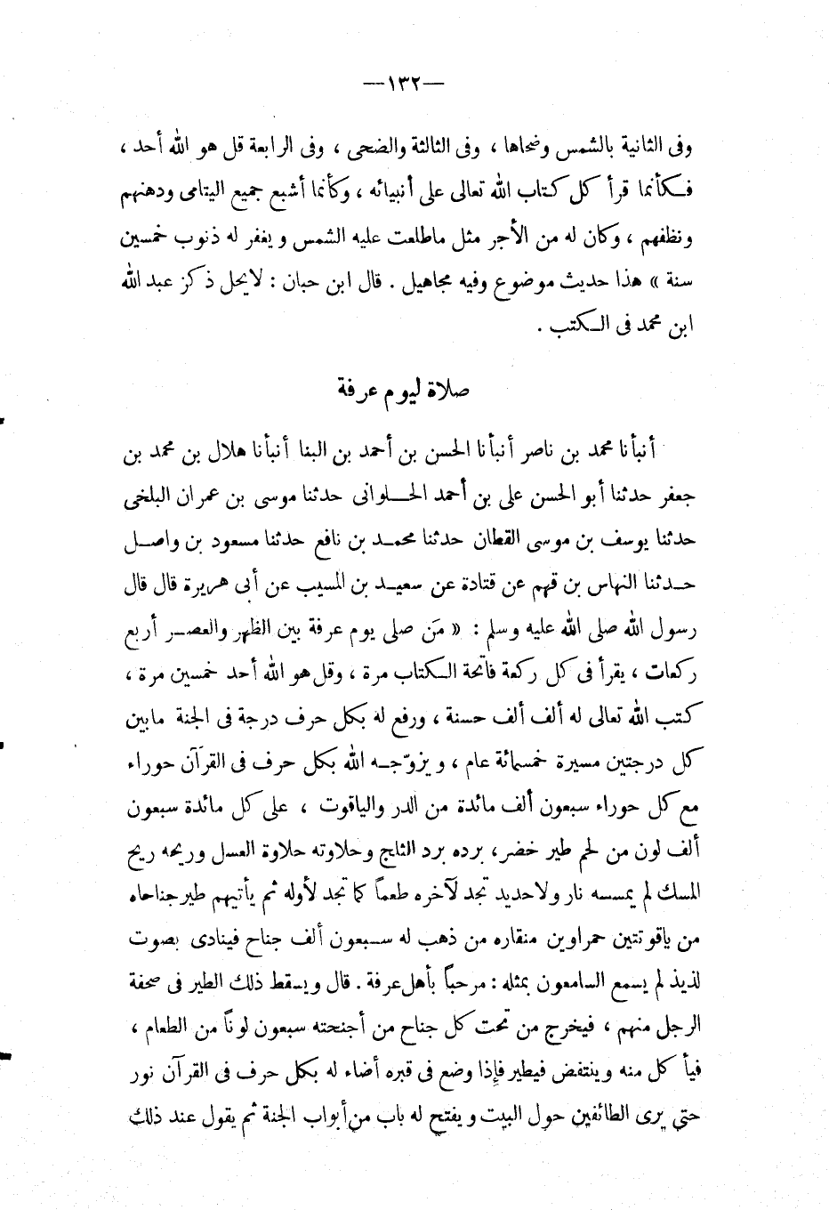 رَسُول الله صَلَّى اللَّهُ عَلَيْهِ وَسَلَّمَ: " مَنْ صَلَّى يَوْمَ عَرَفَة بَيْنَ الظُّهْرِ وَالْعَصْرِ أَرْبَعَ رَكْعَاتٍ، يَقْرَأُ فِي كُلِّ رَكْعَةٍ فَاتِحَة الْكتاب مرّة، وَقل هُوَ اللَّهُ أَحَدٌ خَمْسِينَ مَرَّةً، كَتَبَ اللَّهُ تَعَالَى لَهُ أَلْفَ أَلْفِ حَسَنَةٍ، وَرُفِعَ لَهُ بِكُلِّ حَرْفٍ دَرَجَةً فِي الْجَنَّةِ مَا بَين كل دَرَجَتَيْنِ مسيرَة خَمْسمِائَة عَامٍ، وَيُزَوِّجُهُ اللَّهُ بِكُلِّ حَرْفٍ فِي الْقُرْآنِ حَوْرَاءُ مَعَ كُلِّ حَوْرَاءَ سَبْعُونَ أَلْفَ مَائِدَةٍ مِنَ الدُّرِّ وَالْيَاقُوتِ، عَلَى كُلِّ مَائِدَةٍ سَبْعُونَ أَلْفَ لَوْنٍ مِنْ لَحْمِ طَيْرٍ خُضْرٍ، بَرْدُهُ بَرْدُ الثَّلْجِ وَحَلاوَتُهُ حَلاوَةُ الْعَسَلِ وَرِيحُهُ رِيحُ الْمِسْكِ لَمْ يَمْسَسْهُ نَارٌ وَلا حَدِيدٌ تَجِدُ لآخِرِهِ طَعْمًا كَمَا تَجِدُ لأَوَّلِهِ ثُمَّ يَأْتِيهِمْ طَيْرٌ جَنَاحَاهُ مِنْ يَاقُوتَتَيْنِ حَمْرَاوَيْنِ مِنْقَارُهُ مِنْ ذَهَبٍ لَهُ سَبْعُونَ أَلْفَ جَنَاحٍ فَيُنَادِي بِصَوْتٍ لَذِيذٍ لَمْ يَسْمَعِ السَّامِعُونَ بِمِثْلِهِ: مَرْحَبًا بِأَهْلِ عَرَفَةَ.