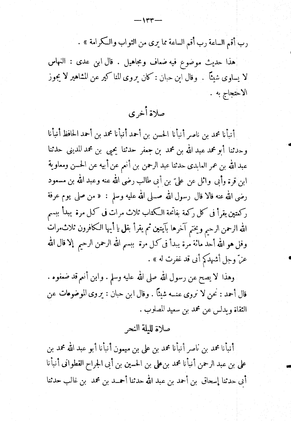صَلَاة لليلة النَّحْر أَنْبَأَنَا مُحَمَّدُ بْنُ نَاصِرٍ أَنْبَأَنَا مُحَمَّدُ بْنُ عَلِيِّ بْنِ مَيْمُونٍ أَنبأَنَا أَبُو عبد الله مُحَمَّد بن على بن عبد الرحمن أَنْبَأَنَا مُحَمَّدُ بْنُ عَلِيِّ بْنِ الْحُسَيْنِ بْنِ أَبِي الْجَرَّاحِ الْقَطَوَانِيُّ أَنْبَأَنَا أَبِي حَدَّثَنَا إِسْحَاقُ بْنُ أَحْمد بن عبد الله حَدثنَا أَحْمد بن مُحَمَّد بن غَالب حَدثنَا
