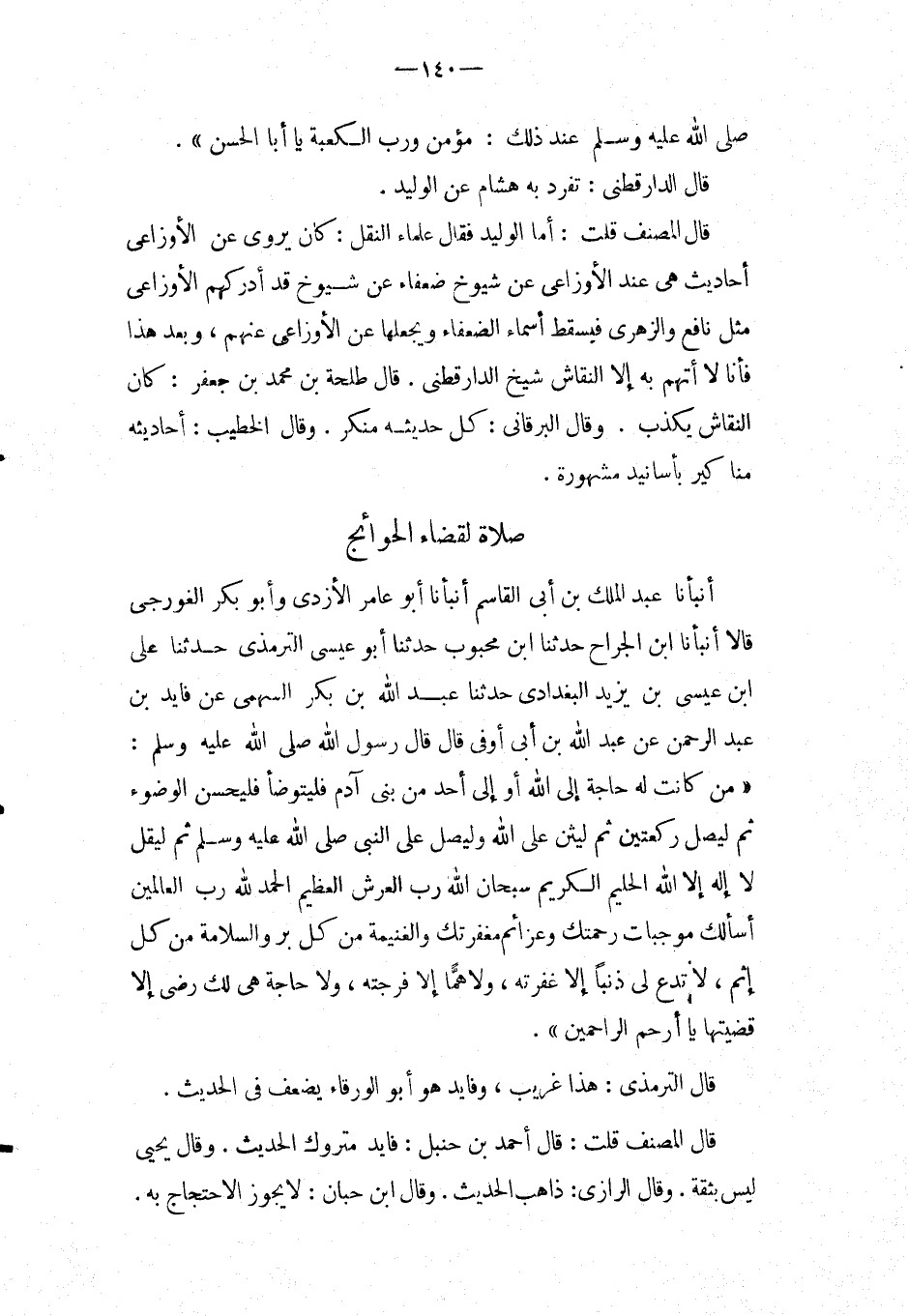 صَلَاة لقَضَاء الْحَوَائِج أَنبأَنَا عبد الملك بْنُ أَبِي الْقَاسِمِ أَنْبَأَنَا أَبُو عَامر الْأَزْدِيّ وَأَبُو بكر الغورجي قَالا أَنْبَأَنَا ابْنُ الْجَرَّاحِ حَدَّثَنَا ابْنُ مَحْبُوبٍ حَدَّثَنَا أَبُو عِيسَى التِّرْمِذِيّ حَدثنَا على ابْن عِيسَى بْنِ يَزِيدَ الْبَغْدَادِيُّ حَدَّثَنَا عبد الله بْنُ بَكْرٍ السَّهْمِيُّ عَنْ فَايِدِ بن عبد الرحمن عَن عبد الله بْنِ أَبِي أَوْفَى قَالَ قَالَ رَسُول الله صَلَّى اللَّهُ عَلَيْهِ وَسَلَّمَ: " مَنْ كَانَتْ لَهُ حَاجَةٌ إِلَى اللَّهِ أَوْ إِلَى أَحَدٍ مِنْ بَنِي آدَمَ فَلْيَتَوَضَّأْ فَلْيُحْسِنِ الْوُضُوءَ ثُمَّ لْيُصَلِّ رَكْعَتَيْنِ ثُمَّ لْيُثْنِ عَلَى اللَّهِ وَلْيُصَلِّ عَلَى النَّبِي صَلَّى اللَّهُ عَلَيْهِ وَسَلَّمَ ثُمَّ لْيَقُلْ لَا إِلَهَ إِلا اللَّهُ الْحَلِيمُ الْكَرِيمُ سُبْحَانَ اللَّهِ رَبِّ الْعَرْشِ الْعَظِيمِ الْحَمْدُ لِلَّهِ رَبِّ الْعَالَمِينَ أَسْأَلُكَ مُوجِبَاتِ رَحْمَتِكَ وَعَزَائِمَ مَغْفِرَتِكَ وَالْغَنِيمَةَ مِنْ كُلِّ بِرٍّ وَالسَّلامَةَ مِنْ كُلِّ إِثْمٍ، لَا تَدَعُ لِي ذَنْبًا إِلا غَفَرْتَهُ، وَلا هَمًّا إِلا فَرَّجْتَهُ، وَلَا حَاجَة هِيَ لَك رضى إِلا قَضَيْتَهَا يَا أَرْحَمَ الرَّاحِمِينَ ".