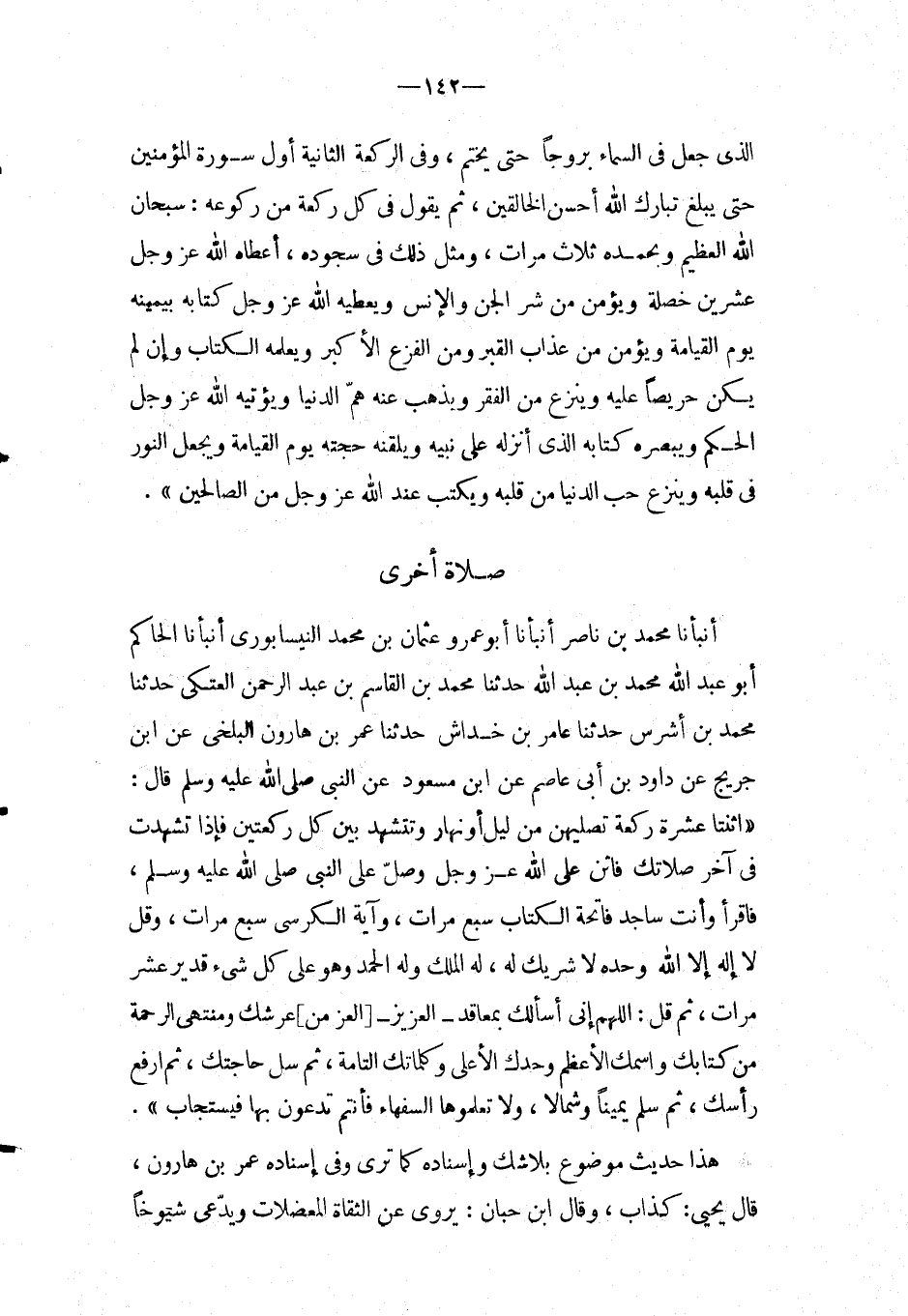 صَلَاة أُخْرَى أَنْبَأَنَا مُحَمَّدُ بْنُ نَاصِرٍ أَنْبَأَنَا أَبُو عَمْرٍو عُثْمَانُ بْنُ مُحَمَّدٍ النَّيْسَابُورِيُّ أَنْبَأَنَا الْحَاكِمُ أَبُو عَبْدِ الله مُحَمَّد بن عبد الله حَدَّثَنا مُحَمَّدُ بْنُ الْقَاسِمِ بْنِ عبد الرحمن الْعَتَكِيُّ حَدَّثَنَا مُحَمَّدُ بْنُ أَشْرَسَ حَدَّثَنَا عَامِرُ بْنُ خَدَاشٍ حَدَّثَنَا عُمَرُ بْنُ هَارُونَ الْبَلْخِيُّ عَنِ ابْنِ جُرَيْجٍ عَنْ دَاوُدَ بْنِ أَبِي عَاصِمٍ عَنِ ابْنِ مَسْعُودٍ عَن النَّبِي صَلَّى اللَّهُ عَلَيْهِ وَسَلَّمَ قَالَ: " اثْنَتَا عَشْرَةَ رَكْعَةً تُصَلِّيهِنَّ مِنْ لَيْلٍ أَوْ نَهَارٍ وَتَتَشَهَّدُ بَيْنَ كُلِّ رَكْعَتَيْنِ فَإِذَا تَشَهَّدْتَ فِي آخِرِ صَلاتِكَ فَاثْنِ على الله عزوجل وَصَلِّ عَلَى النَّبِيِّ صَلَّى اللَّهُ عَلَيْهِ وَسَلَّمَ، فَاقْرَأْ وَأَنْتَ سَاجِدٌ فَاتِحَةَ الْكِتَابِ سَبْعَ مَرَّاتٍ، وَآيَةَ الْكُرْسِيِّ سَبْعَ مَرَّاتٍ، وَقُلْ لَا إِلَهَ إِلا اللَّه وَحْدَهُ لَا شرك لَهُ، لَهُ الْمُلْكُ وَلَهُ الْحَمْدُ وَهُوَ على كل شئ قَدِيرٌ عَشْرَ مَرَّاتٍ، ثُمَّ قُلِ: اللَّهُمَّ إنى أَسأَلك بمعاقد - الْعَزِيز -[الْعِزِّ مِنْ] عَرْشِكَ وَمُنْتَهَى الرَّحْمَةِ مِنْ كِتَابِكَ وَاسْمِكَ الأَعْظَمِ وَحَدِّكَ الأَعْلَى وَكَلِمَاتِكَ التَّامَّةِ، ثُمَّ سَلْ حَاجَتَكَ، ثُمَّ ارْفَعْ رَأْسَكَ، ثُمَّ سَلِّمْ يَمِينًا وَشِمَالا، وَلا تُعَلِّمُوهَا السُّفَهَاءَ فَأَنْتُمْ تَدْعُونَ بِهَا فَيُسْتَجَابُ ".