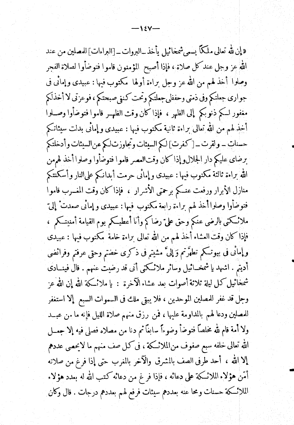 " إِنَّ لِلَّهِ تَعَالَى مَلَكًا يُسَمَّى شمخائيل يَأْخُذ - البروات -[الْبَرَاءَاتِ] لِلْمُصَلِّينَ مِنْ عِنْدِ اللَّهِ عزوجل عِنْدَ كُلِّ صَلاةٍ، فَإِذَا أَصْبَحَ الْمُؤْمِنُونَ قَامُوا فتوضأوا لِصَلاةِ الْفَجْرِ وَصَلُّوا أَخَذَ لَهُمْ من الله عزوجل بَرَاءَةً أَوَّلُهَا مَكْتُوبٌ فِيهَا: عَبِيدِي وَإِمَائِي فِي جِوَارِي جَعَلْتُكُمْ وَفِي ذِمَّتِي وَحِفْظِي جَعَلْتُكُمْ وَتَحْتَ كَنَفِي صَبَّحْتُكُمْ، فَوَعِزَّتِي لَا أَخْذُلُكُمْ مَغْفُورٌ لَكُمْ ذُنُوبُكُمْ إِلَى الظُّهْرِ، فَإِذَا كَانَ وَقت الظّهْر قَامُوا فتوضأوا وصلوا أخذلهم مِنَ اللَّهِ تَعَالَى بَرَاءَةً ثَانِيَةً مَكْتُوبٌ فِيهَا: عَبِيدِي وَإِمَائِي بَدَّلْتُ سَيِّئَاتكُمْ حَسَنَات - ولقرت -[كفرت] لَكُمُ السَّيِّئَاتِ وَتَجَاوَزْتُ لَكُمْ عَنِ السَّيِّئَاتِ وَأَدْخَلْتُكُمْ بِرِضَايَ عَلَيْكُمْ دَارَ الْجَلالِ وَإِذَا كَانَ وَقْتُ الْعَصْرِ قَامُوا فتوضأوا وصلوا أخذلهم مِنَ اللَّهِ بَرَاءَةً ثَالِثَةً مَكْتُوبٌ فِيهَا: عَبِيدِي وَإِمَائِي حَرَّمْتُ أَبْدَانَكُمْ عَلَى النَّارِ وَأَسْكَنْتَكُمْ مَنَازِلَ الأَبْرَارِ وَرَفَعْتُ عَنْكُمْ بِرَحْمَتِي الأَشْرَارَ، فَإِذَا كَانَ وَقت الْمغرب قَامُوا فتوضأوا وصلوا أخذلهم بَرَاءَةً رَابِعَةً مَكْتُوبٌ فِيهَا: عَبِيدِي وإمائي صعدت إِلَى ملائكتي بالرضى عَنْكُمْ وَحُقَّ عَلَيَّ رِضَاكُمْ وَأَنَا أُعْطِيكُمْ يَوْمَ الْقِيَامَةِ أُمْنِيَّتَكُمْ، فَإِذَا كَانَ وَقت الْعشَاء أخذلهم مِنَ اللَّهِ تَعَالَى بَرَاءَةً خَامَةٌ مَكْتُوبٌ فِيهَا: عَبِيدِي وَإِمَائِي فِي بُيُوتِكُمْ تَطَهَّرْتُمْ وَإِلَيَّ مَشَيْتُمْ فِي ذِكْرِي خُضْتُمْ وَحَقِّي عَرَفْتُمْ وَفَرَائِضِي أَدَّيْتُمْ.