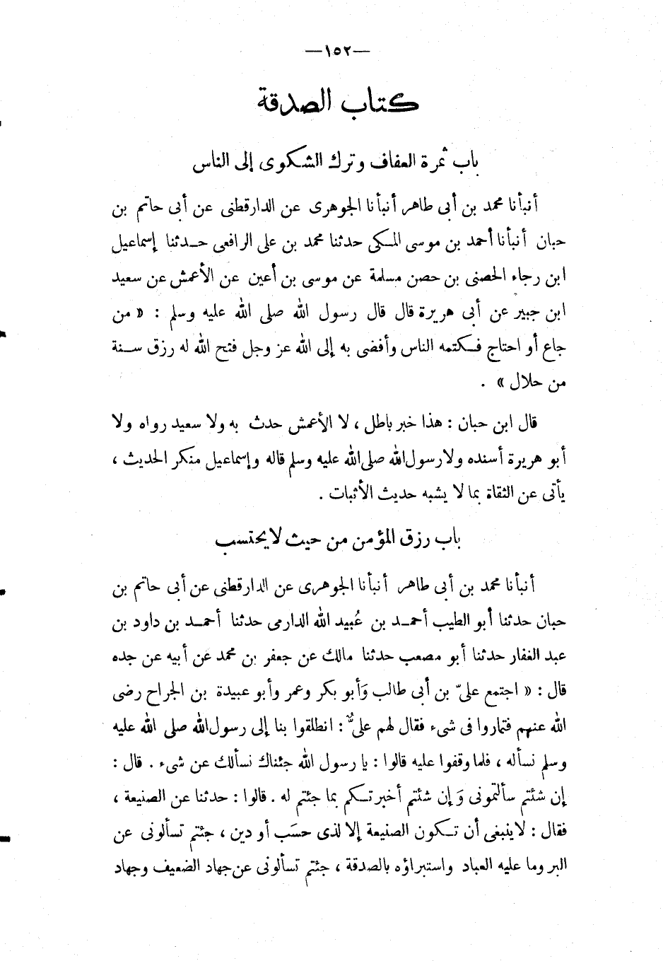 بَاب رزق الْمُؤمن من حَدِيث لَا يحْتَسب أَنْبَأَنَا مُحَمَّدُ بْنُ أَبِي طَاهِرٍ أَنبأَنَا الجوهرى عَن الدَّارقطني عَن أبي حَاتِم بن حبَان حَدَّثَنَا أَبُو الطَّيِّبِ أَحْمَدُ بْنُ عبيد الله الدَّارِمِيُّ حَدَّثَنَا أَحْمَدُ بْنُ دَاوُدَ بْنِ عَبْدِ الْغَفَّارِ حَدَّثَنَا أَبُو مُصْعَبٍ حَدَّثَنَا مَالِكٌ عَنْ جَعْفَرِ بْنِ مُحَمَّدٍ عَنْ أَبِيهِ عَنْ جَدِّهِ قَالَ: " اجْتَمَعَ عَلِيُّ بْنُ أَبِي طَالِبٍ وَأَبُو بَكْرٍ وَعُمَرُ وَأَبُو عُبَيْدَةَ بْنُ الْجَرَّاحِ رَضِيَ الله عَنْهُم فتماروا فِي شئ فَقَالَ لَهُمْ عَلِيٌّ: انْطَلِقُوا بِنَا إِلَى رَسُول الله صَلَّى اللَّهُ عَلَيْهِ وَسَلَّمَ نَسْأَلْهُ، فَلَمَّا وَقَفُوا عَلَيْهِ قَالُوا: يَا رَسُولَ اللَّهِ جئْنَاك نَسْأَلك عَن شئ.