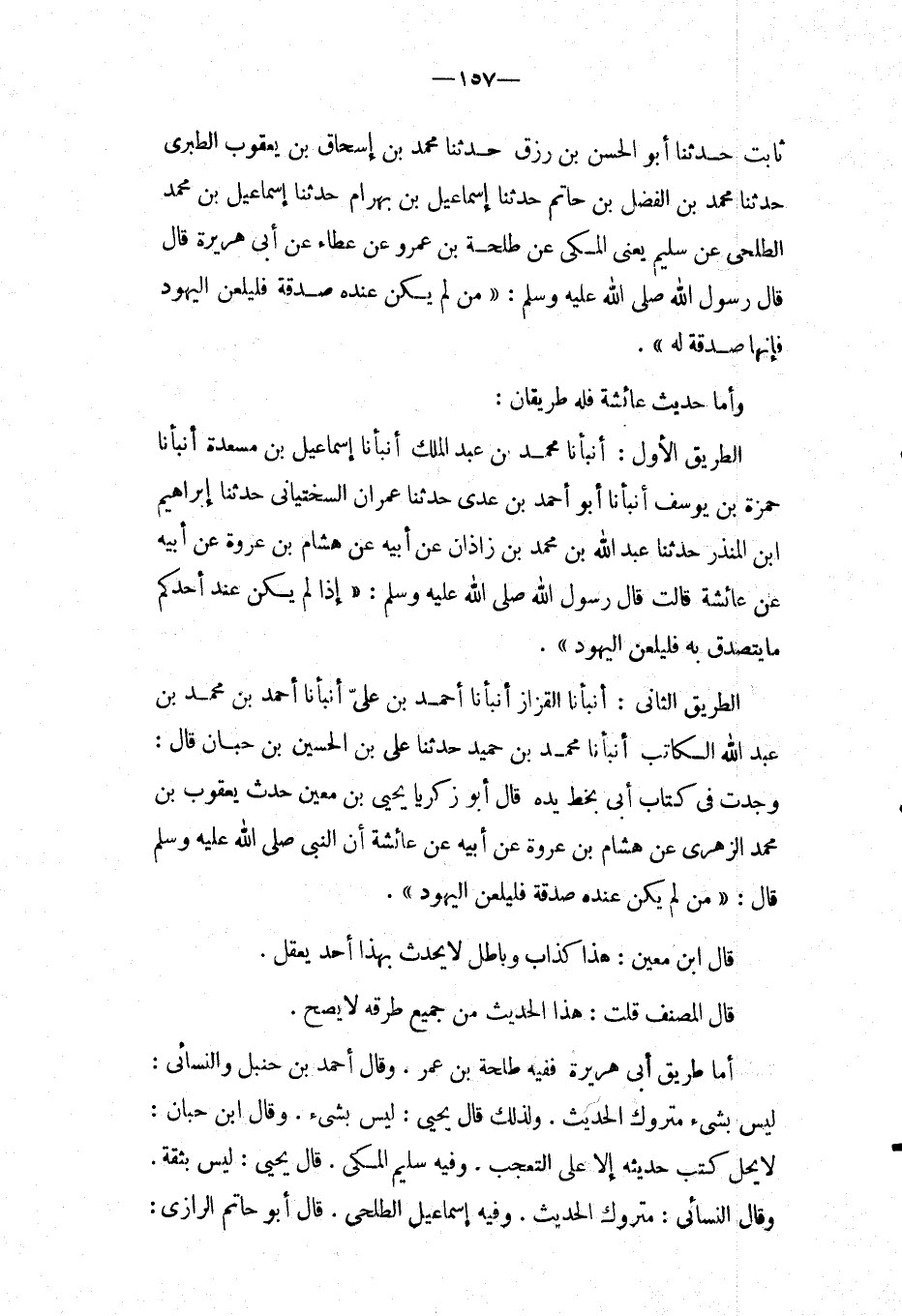 الطَّرِيق الثَّانِي: أَنْبَأَنَا الْقَزَّازُ أَنْبَأَنَا أَحْمَدُ بْنُ عَلِيِّ أَنْبَأَنَا أَحْمَدُ بْنُ مُحَمَّدِ بْنِ عبد الله الْكَاتِبُ أَنْبَأَنَا مُحَمَّدُ بْنُ حُمَيْدٍ حَدَّثَنَا عَلِيُّ بْنُ الْحُسَيْنِ بْنِ حِبَّانَ قَالَ: وَجَدْتُ فِي كِتَابِ أَبِي بِخَطِّ يَدِهِ قَالَ أَبُو زَكَرِيَّا يَحْيَى بْنُ مَعِينٍ حَدَّثَ يَعْقُوبُ بْنُ مُحَمَّدٍ الزُّهْرِيُّ عَنْ هِشَامِ بْنِ عُرْوَةَ عَنْ أَبِيهِ عَنْ عَائِشَةَ أَنَّ النَّبِيَّ صَلَّى اللَّهُ عَلَيْهِ وَسَلَّمَ قَالَ: " من لَمْ يَكُنْ عِنْدَهُ صَدَقَةٌ فَلْيَلْعَنِ الْيَهُودَ ".