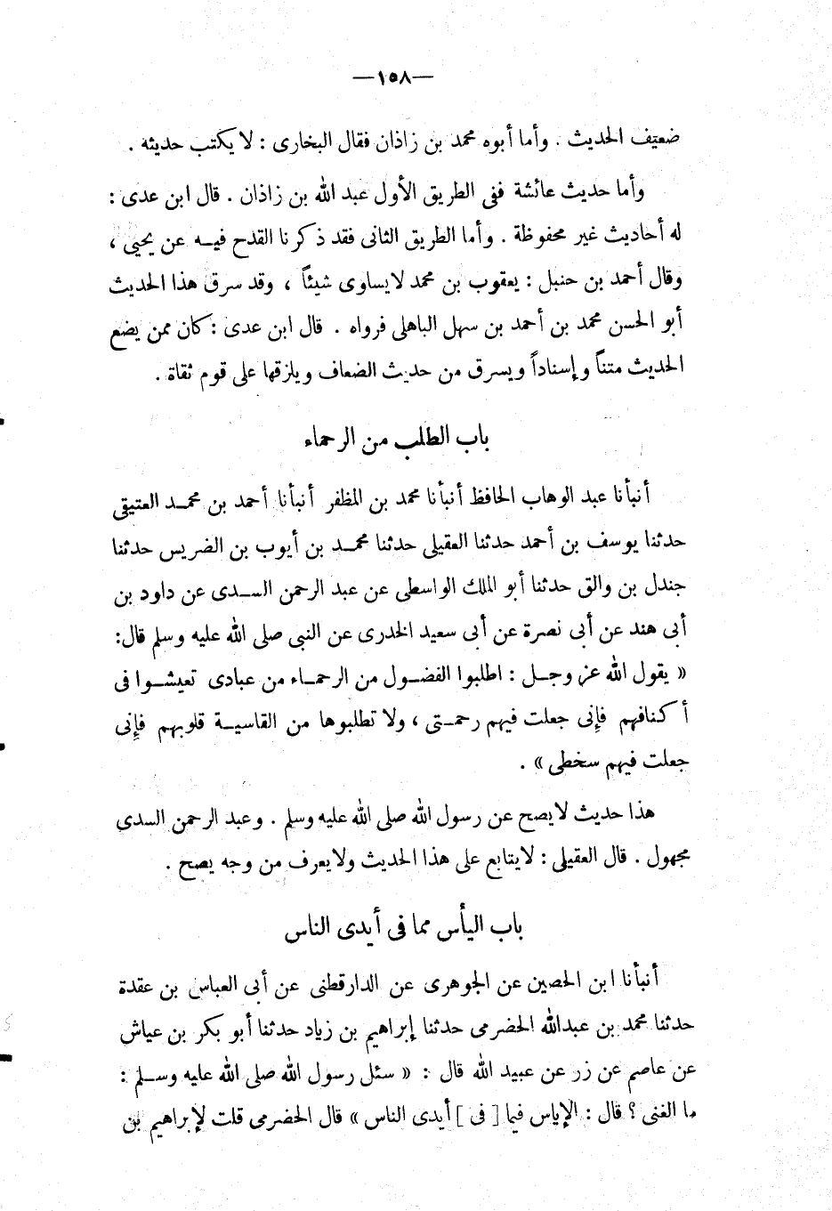 بَاب الطّلب من الرُّحَمَاء أَنْبَأَنَا عَبْدُ الْوَهَّابِ الْحَافِظُ أَنْبَأَنَا مُحَمَّدُ بْنُ الْمُظَفَّرِ أَنْبَأَنَا أَحْمَدُ بْنُ مُحَمَّدٍ الْعَتَيقِيُّ حَدَّثَنَا يُوسُفُ بْنُ أَحْمَدَ حَدَّثَنَا الْعُقَيْلِيُّ حَدَّثَنَا مُحَمَّدُ بْنُ أَيُّوبَ بْنِ الضُّرَيْسِ حَدَّثَنَا جَنْدَلُ بْنُ وَالِقٍ حَدَّثَنَا أَبُو الْملك الوَاسِطِيّ عَن عبد الرحمن السُّدِّيِّ عَنْ دَاوُدَ بْنِ أَبِي هِنْدٍ عَنْ أَبِي نَصْرَةَ عَنْ أَبِي سَعِيدٍ الْخُدْرِيِّ عَنِ النَّبِيِّ صَلَّى اللَّهُ عَلَيْهِ وَسَلَّمَ قَالَ: " يَقُول الله عزوجل: اطْلُبُوا الْفُضُولَ مِنَ الرُّحَمَاءِ مِنْ عِبَادِي تَعِيشُوا فِي أَكْنَافِهِمْ فَإِنِّي جَعَلْتُ فِيهِمْ رَحْمَتِي، وَلا تَطْلُبُوهَا مِنَ الْقَاسِيَةِ قُلُوبُهُمْ فَإِنِّي جَعَلْتُ فِيهِمْ سَخَطِي ".