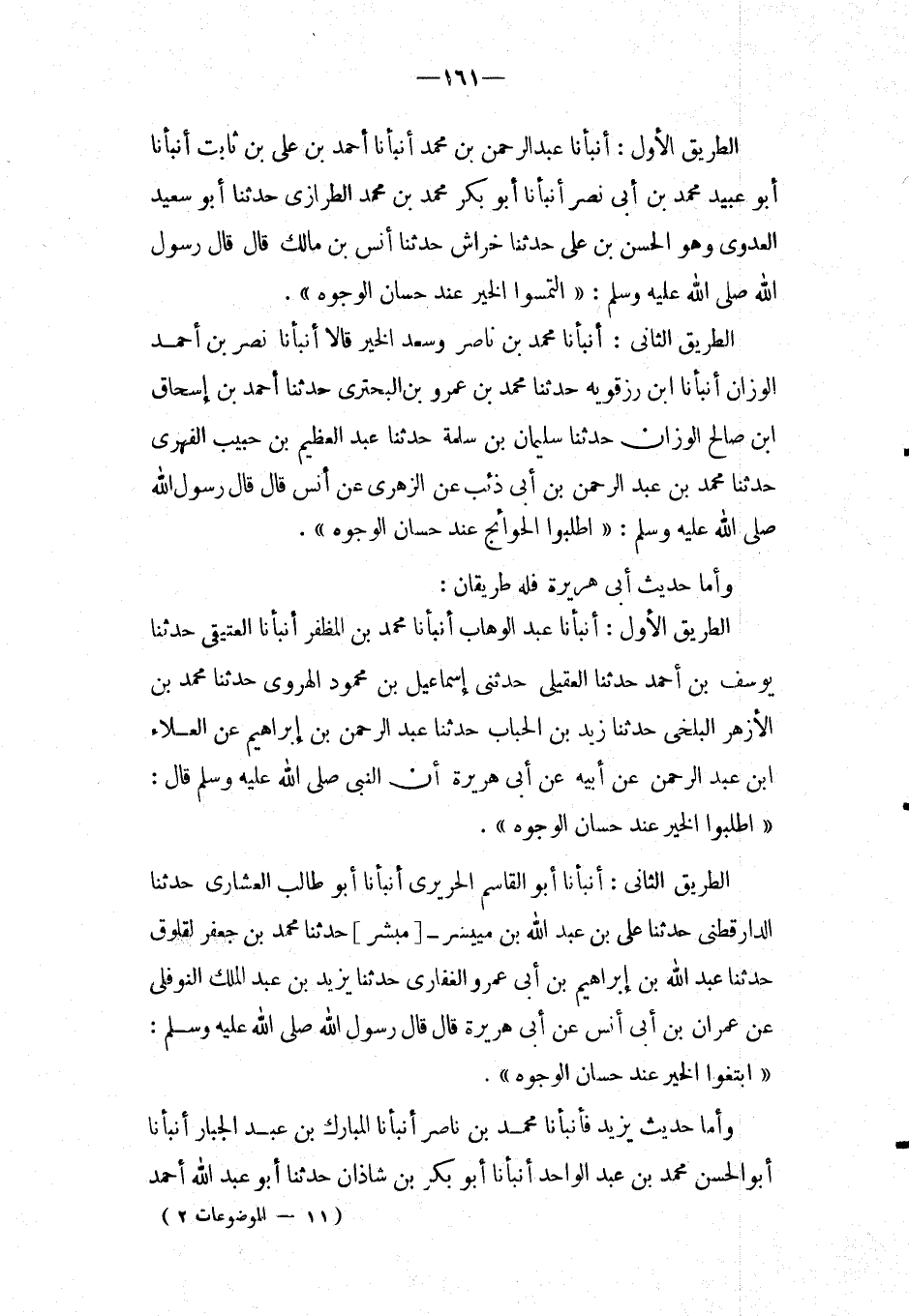 وَأما حَدِيث أَبِي هُرَيْرَةَ فَلهُ طَرِيقَانِ: الطَّرِيق الأول: أَنْبَأَنَا عَبْدُ الْوَهَّابِ أَنْبَأَنَا مُحَمَّدُ بْنُ الْمُظَفَّرِ أَنْبَأَنَا الْعَتِيقِيُّ حَدَّثَنَا يُوسُفُ بْنُ أَحْمَدَ حَدَّثَنَا الْعَقِيلِيُّ حَدَّثَنِي إِسْمَاعِيلُ بْنُ مَحْمُودٍ الْهَرَوِيُّ حَدَّثَنَا مُحَمَّدُ بْنُ الأَزْهَرِ الْبَلْخِيُّ حَدَّثَنَا زَيْدُ بن الْحباب حَدثنَا عبد الرحمن بن إِبْرَاهِيم عَن الْعَلَاء ابْن عبد الرحمن عَن أَبِيه عَن أبي هُرَيْرَة إِن النَّبِي صَلَّى اللَّهُ عَلَيْهِ وَسَلَّمَ قَالَ: " اطْلُبُوا الْخَيْرَ عِنْدَ حِسَانِ الْوُجُوهِ ".