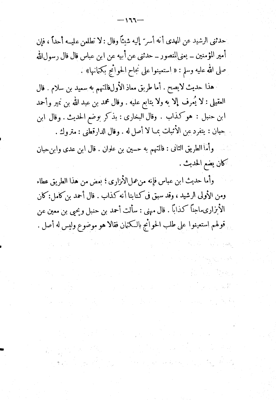 حَدَّثَنِي الرَّشِيدُ عَنِ الْمَهْدِيِّ أَنَّهُ أَسَرَّ إِلَيْهِ شَيْئًا وَقَالَ: لَا تُطْلِعَنَّ عَلَيْهِ أَحَدًا، فَإِنَّ أَمِيرَ الْمُؤْمِنِينَ - يَعْنِي الْمَنْصُورَ - حَدَّثَنِي عَنْ أَبِيهِ عَنِ ابْنِ عَبَّاسٍ قَالَ قَالَ رَسُول الله صَلَّى اللَّهُ عَلَيْهِ وَسَلَّمَ: " اسْتَعِينُوا عَلَى نَجَاحِ الْحَوَائِجِ بِكِتْمَانِهَا ".