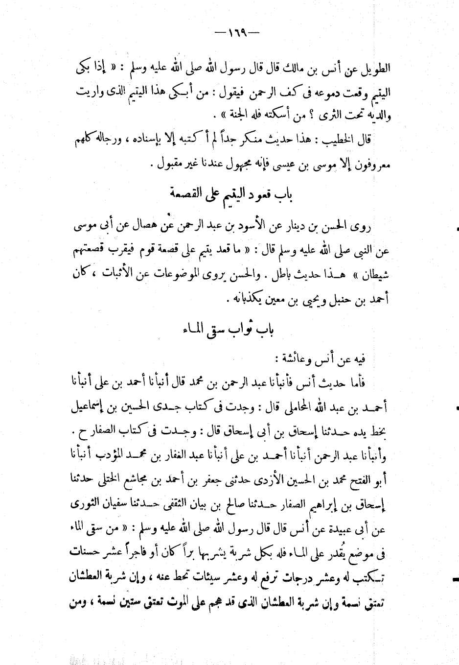 بَاب ثَوَاب سقى المَاء فِيهِ عَنْ أَنَس وَعَائِشَة: فَأَما حَدِيث أَنَس فأنبأنا عبد الرحمن بْنُ مُحَمَّدٍ قَالَ أَنْبَأَنَا أَحْمَدُ بْنُ عَلِيٍّ أَنْبَأَنَا أَحْمَدُ بْنُ عبد الله الْمَحَامِلِيُّ قَالَ: وَجَدْتُ فِي كِتَابِ جَدِّي الْحُسَيْنِ بْنِ إِسْمَاعِيلَ بِخَطِّ يَدِهِ حَدَّثَنَا إِسْحَاقُ بْنُ أَبِي إِسْحَاقَ قَالَ: وَجَدْتُ فِي كِتَابِ الصفارح.