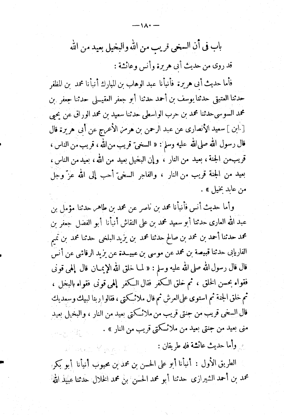 بَاب فِي أَن السَّخِيّ قَرِيبٌ مِنَ اللَّهِ والبخيل بَعِيدٌ مِنَ اللَّهِ قَدْ روى من حَدِيث أَبِي هُرَيْرَةَ وَأنس وعَائِشَة: فَأَما حَدِيث أَبِي هُرَيْرَةَ فَأَنْبَأَنَا عَبْدُ الْوَهَّابِ بْنُ الْمُبَارَكِ أَنْبَأَنَا مُحَمَّدُ بْنُ الْمُظَفَّرِ حَدَّثَنَا الْعَتَيقِيُّ حَدَّثَنَا يُوسُفُ بْنُ أَحْمَدَ حَدَّثَنَا أَبُو جَعْفَرٍ الْعَقِيلِيُّ حَدَّثَنَا جَعْفَرُ بْنُ مُحَمَّدٍ السُّوسِيُّ حَدَّثَنَا مُحَمَّدُ بْنُ حَرْبٍ الْوَاسِطِيُّ حَدَّثَنَا سَعِيدُ بْنُ مُحَمَّدٍ الْوراق عَن يحيى [ابْن] سعيد الانصاري عَن عبد الرحمن بْنِ هُرْمُزَ الأَعْرَجِ عَنْ أَبِي هُرَيْرَةَ قَالَ