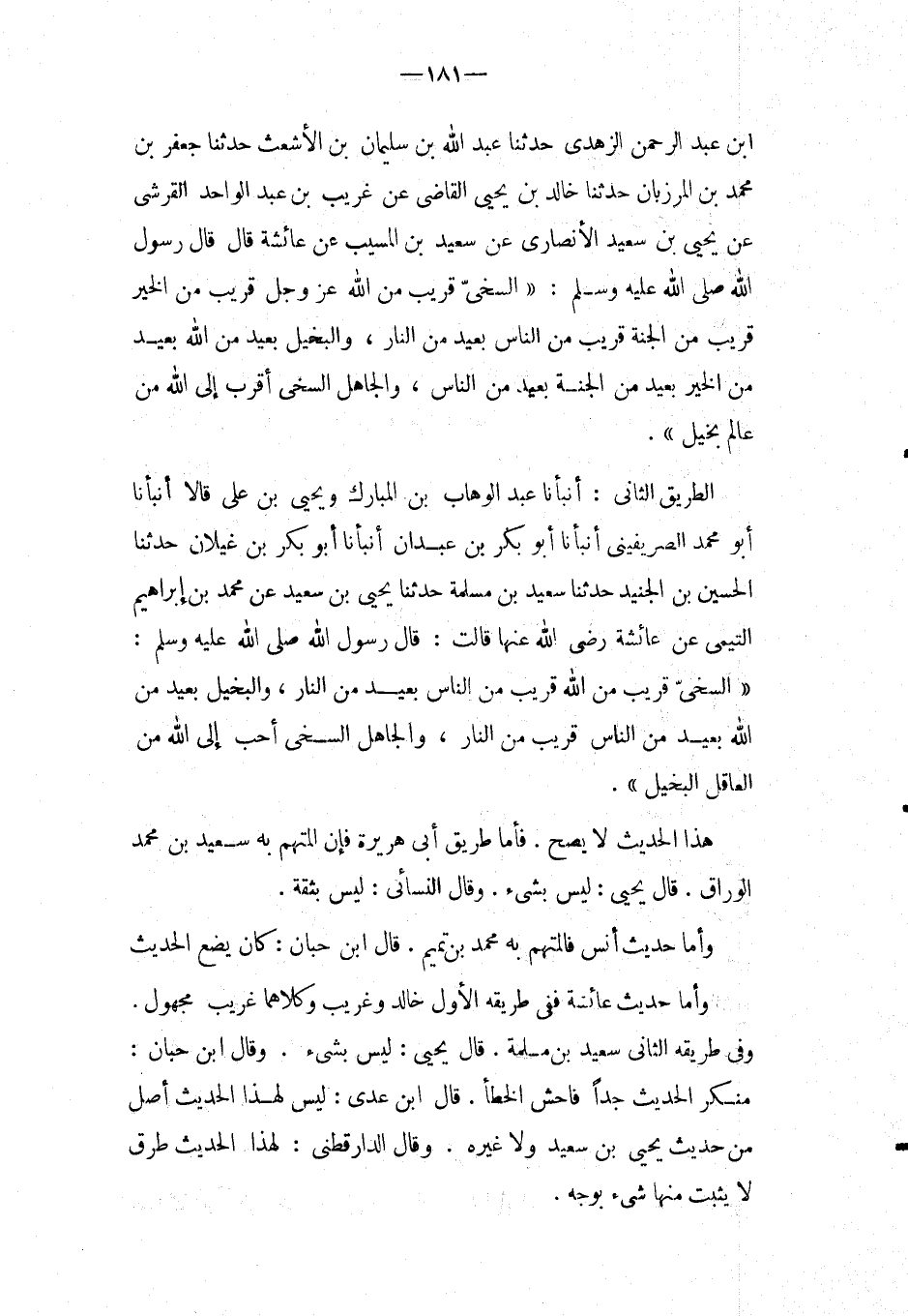 الطَّرِيق الثَّانِي: أَنبأَنَا عبد الْوَهَّاب بن الْمُبَارك وَيَحْيَى بْنُ عَلِيٍّ قَالا أَنْبَأَنَا أَبُو مُحَمَّدٍ الصَّرِيفِينِيُّ أَنْبَأَنَا أَبُو بَكْرِ بْنُ عَبْدَانَ أَنْبَأَنَا أَبُو بَكْرِ بْنُ غَيْلانَ حَدَّثَنَا الْحُسَيْنُ بْنُ الْجُنَيْدِ حَدَّثَنَا سَعِيدُ بْنُ مَسْلَمَةَ حَدَّثَنَا يَحْيَى بْنُ سَعِيدٍ عَنْ مُحَمَّدِ بْنِ إِبْرَاهِيمَ التَّيْمِيِّ عَن عَائِشَة رَضِي الله عَنْهَا قَالَتْ: قَالَ رَسُولُ اللَّهِ صَلَّى اللَّهُ عَلَيْهِ وَسَلَّمَ: " السَّخِيُّ قَرِيبٌ مِنَ اللَّهِ قَرِيبٌ مِنَ النَّاسِ مقريب مِنَ النَّارِ، وَالْبَخِيلُ بَعِيدٌ مِنَ اللَّهِ بَعِيدٌ مِنَ النَّاسِ قَرِيبٌ مِنَ النَّارِ، وَالْجَاهِلُ السَّخِيُّ أَحَبُّ إِلَى اللَّهِ مِنَ الْعَاقِلِ الْبَخِيلِ ".