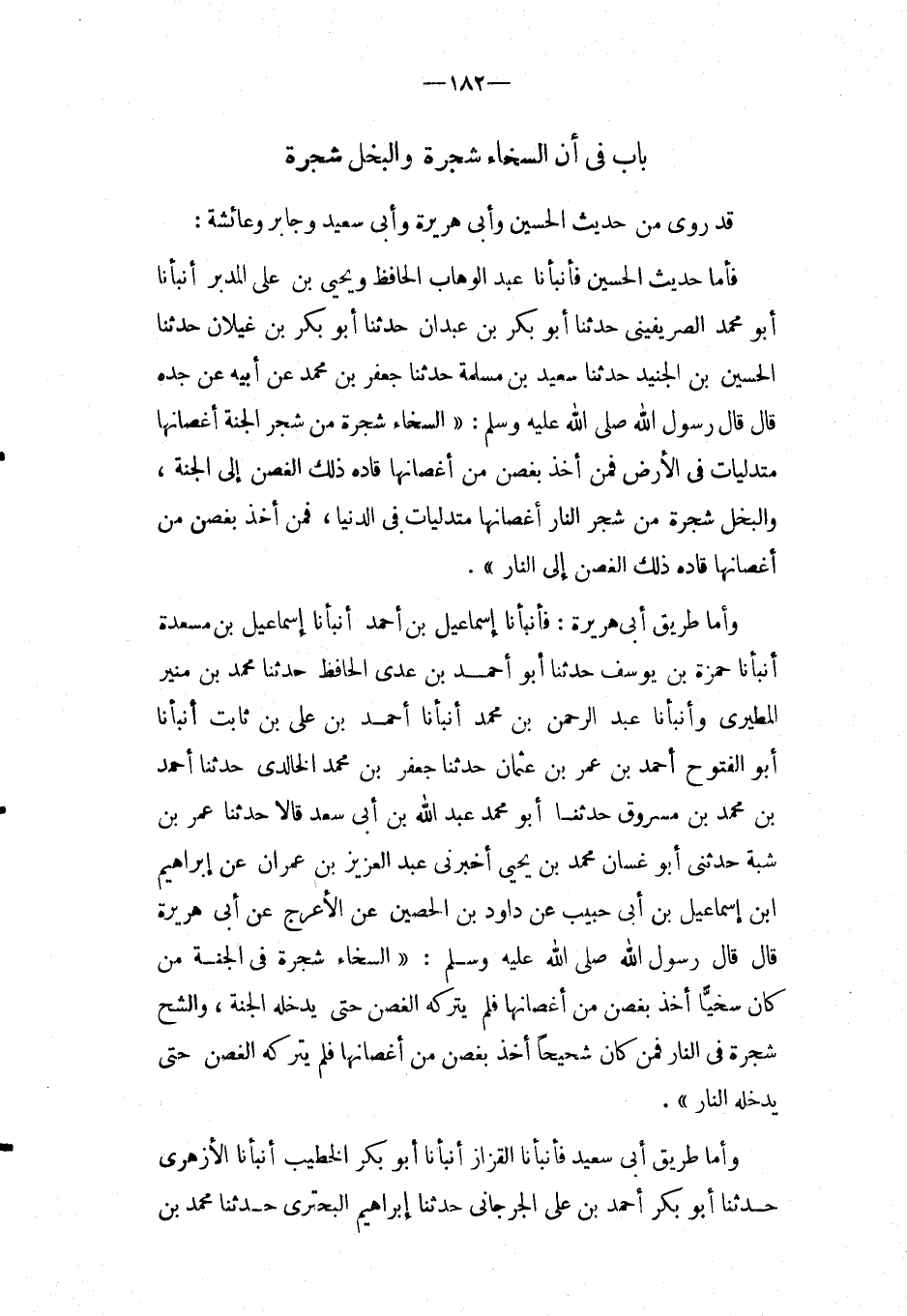 وَأما طَرِيق أَبِي هُرَيْرَةَ: فأَنْبَأَنَا إِسْمَاعِيلُ بْنُ أَحْمَدَ أَنْبَأَنَا إِسْمَاعِيلُ بْنُ مَسْعَدَةَ أَنْبَأَنَا حَمْزَةُ بْنُ يُوسُفَ حَدَّثَنَا أَبُو أَحْمد بن عدي الْحَافِظ حَدَّثَنَا مُحَمَّدُ بْنُ مُنِيرٍ الْمَطِيرِيُّ وأنبأنا عبد الرحمن بْنُ مُحَمَّدٍ أَنْبَأَنَا أَحْمَدُ بْنُ عَلِيِّ بْنِ ثَابِتٍ أَنْبَأَنَا أَبُو الْفُتُوحِ أَحْمَدُ بْنُ عُمَرَ بْنِ عُثْمَانَ حَدَّثَنَا جَعْفَرُ بْنُ مُحَمَّدٍ الْخَالِدِيُّ حَدَّثَنَا أَحْمَدُ بْنُ مُحَمَّدِ بْنِ مَسْرُوقٍ حَدَّثَنَا أَبُو مُحَمَّدٍ عبد الله بْنُ أَبِي سَعْدٍ قَالا حَدَّثَنَا عُمَرُ بْنُ شَبَّةَ حَدَّثَنِي أَبُو غَسَّانَ مُحَمَّدُ بْنُ يَحْيَى أَخْبَرَنِي عَبْدُ الْعَزِيزِ بْنُ عِمْرَانَ عَنْ إِبْرَاهِيم ابْن إِسْمَاعِيلَ بْنِ أَبِي حَبِيبٍ عَنْ دَاوُدَ بْنِ الْحُصَيْنِ عَنِ الأَعْرَجِ عَنْ أَبِي هُرَيْرَةَ قَالَ قَالَ رَسُول الله صَلَّى اللَّهُ عَلَيْهِ وَسَلَّمَ: " السَّخَاءُ شَجَرَةٌ فِي الْجَنَّةِ مَنْ كَانَ سَخِيًّا أَخَذَ بِغُصْنٍ مِنْ أَغْصَانِهَا فَلَمْ يَتْرُكْهُ الْغُصْنُ حَتَّى يُدْخِلَهُ الْجَنَّةَ، وَالشُّحُّ شَجَرَةٌ فِي النَّارِ فَمَنْ كَانَ شَحِيحًا أَخَذَ بِغُصْنٍ مِنْ أَغْصَانِهَا فَلَمْ يَتْرُكْهُ الْغُصْنُ حَتَّى يُدْخِلَهُ النَّارَ ".
