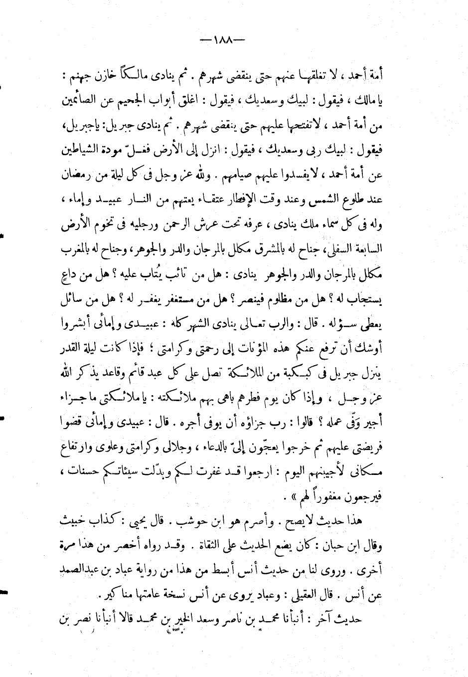 ثُمَّ يُنَادِي مَالِكًا خَازِنَ جَهَنَّمَ: يَا مَالِكُ، فَيَقُولُ: لَبَّيْكَ وَسَعْدَيْكَ، فَيَقُولُ: أَغْلِقْ أَبْوَابَ الْجَحِيمِ عَنِ الصَّائِمِينَ مِنْ أُمَّةِ أَحْمَدَ، لَا تَفْتَحْهَا عَلَيْهِمْ حَتَّى يَنْقَضِيَ شَهْرُهُمْ.