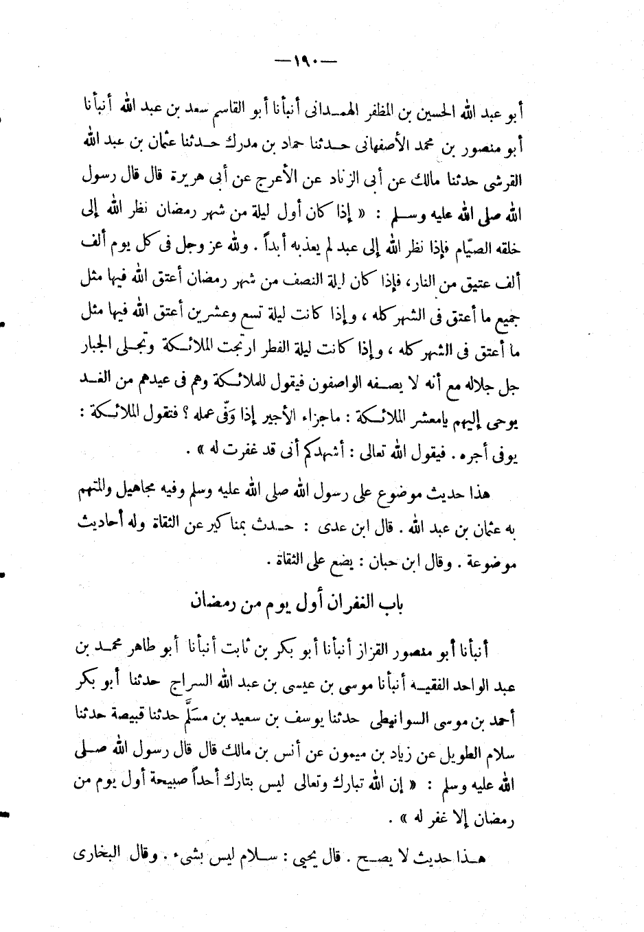 بَاب الغفران أول يَوْم من رَمَضَان أَنْبَأَنَا أَبُو مَنْصُورٍ الْقَزَّازُ أَنْبَأَنَا أَبُو بَكْرِ بْنُ ثَابِتٍ أَنْبَأَنَا أَبُو طَاهِرٍ مُحَمَّدُ بْنُ عَبْدِ الْوَاحِدِ الْفَقِيهُ أَنْبَأَنَا مُوسَى بْنُ عِيسَى بن عبد الله السَّرَّاجُ حَدَّثَنَا أَبُو بَكْرٍ أَحْمَدُ بْنُ مُوسَى السَّوَانِيطِيُّ حَدَّثَنَا يُوسُفُ بْنُ سَعِيدٍ بْنِ مُسْلِمٍ حَدَّثَنَا قَبِيصَةُ حَدَّثَنَا سَلامٌ الطَّوِيلُ عَنْ زِيَادِ بْنِ مَيْمُونٍ عَنْ أَنَسِ بْنِ مَالِكٍ قَالَ قَالَ رَسُولُ الله صَلَّى اللَّهُ عَلَيْهِ وَسَلَّمَ: " إِنَّ اللَّهَ تَبَارَكَ وَتَعَالَى لَيْسَ بِتَارِكٍ أَحَدًا صَبِيحَةَ أَوَّلِ يَوْمٍ مِنْ رَمَضَانَ إِلا غَفَرَ لَهُ ".