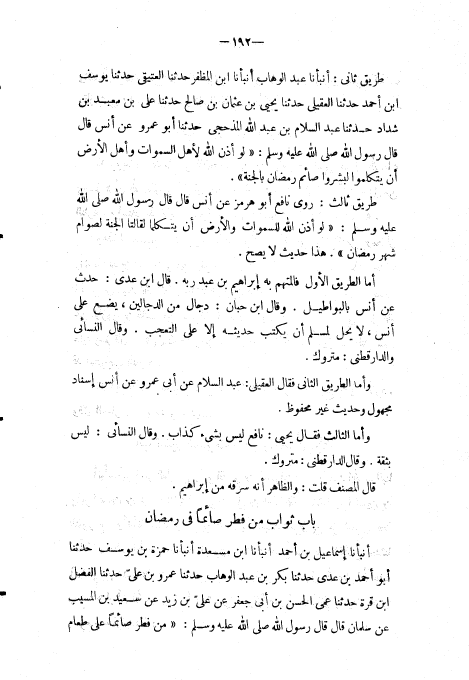 طَرِيق ثَانِي: أَنْبَأَنَا عَبْدُ الْوَهَّابِ أَنْبَأَنَا ابْنُ الْمُظَفَّرِ حَدَّثَنَا الْعَتَيقِيُّ حَدثنَا يُوسُف ابْن أَحْمَدَ حَدَّثَنَا الْعَقِيلِيُّ حَدَّثَنَا يَحْيَى بْنِ عُثْمَانَ بْنِ صَالِحٍ حَدَّثَنَا عَلِيُّ بْنُ مَعْبدِ بْنِ شَدَّادٍ حَدثنَا عبد السَّلَام بن عبد الله الْمَذْحِجِيُّ حَدَّثَنَا أَبُو عَمْرٍو عَنْ أَنْسٍ قَالَ قَالَ رَسُولُ اللَّهِ صَلَّى اللَّهُ عَلَيْهِ وَسَلَّمَ: " لَوْ أَذِنَ اللَّهُ لأَهْلِ السَّمَوَاتِ وَأَهْلِ الأَرْضِ أَنْ يَتَكَلَّمُوا لَبَشَّرُوا صَائِمَ رَمَضَانَ بِالْجَنَّةِ ".