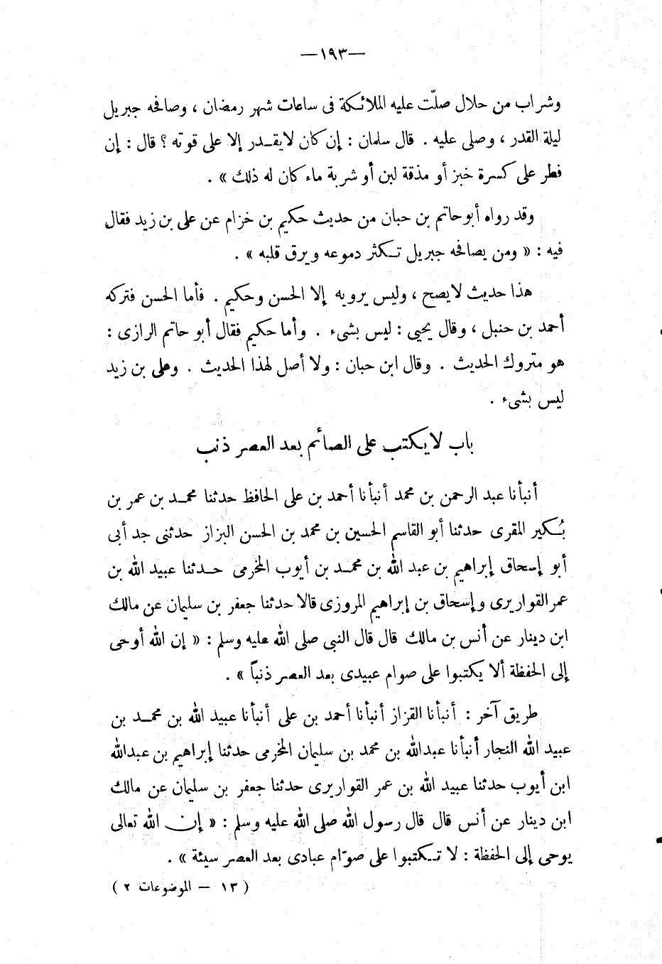 ابْن دِينَارٍ عَنْ أَنَسٍ قَالَ قَالَ رَسُول الله صَلَّى اللَّهُ عَلَيْهِ وَسَلَّمَ: " إِنَّ اللَّهَ تَعَالَى يُوحِي إِلَى الْحَفَظَةِ: لَا تَكْتُبُوا عَلَى صُوَّامِ عِبَادِي بَعْدَ الْعَصْرِ سَيِّئَةً ".