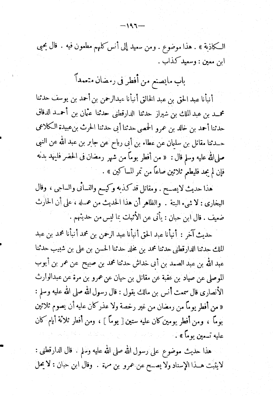 بَاب مَا يصنع مَنْ أَفْطَرَ فِي رَمَضَان مُتَعَمدا أَنْبَأَنَا عَبْدُ الْحَقِّ بْنُ عَبْدِ الْخَالِق أَنبأَنَا عبد الرحمن بْنِ أَحْمَدَ بْنِ يُوسُفَ حَدَّثَنَا مُحَمَّد بن عبد الملك بْنِ شِيرَازَ حَدَّثَنَا الدَّارَقُطْنِيُّ حَدَّثَنَا عُثْمَانُ بْنُ أَحْمَدَ الدَّقَّاقُ حَدَّثَنَا أَحْمَدُ بْنُ خَالِدِ بْنِ عَمْرٍو الْحِمْصِيُّ حَدَّثَنَا أَبِي حَدَّثَنَا الْحَرْثُ بْنُ عُبَيْدَةَ الْكَلاعِيُّ حَدَّثَنَا مُقَاتِلُ بْنُ سُلَيْمَانَ عَنْ عَطَاءِ بْنِ أَبِي رَبَاحٍ عَنْ جَابِرِ بْنِ عبد الله عَن النَّبِي صَلَّى اللَّهُ عَلَيْهِ وَسَلَّمَ قَالَ: " مَنْ أَفْطَرَ يَوْمًا مِنْ شَهْرِ رَمَضَانَ فِي الْحَضَرِ فَلْيُهْدِ بَدَنَةً فَإِنْ لَمْ يَجِدْ فَلْيُطْعِمْ ثَلاثِينَ صَاعًا مِنْ تَمْرٍ الْمَسَاكِينَ ".