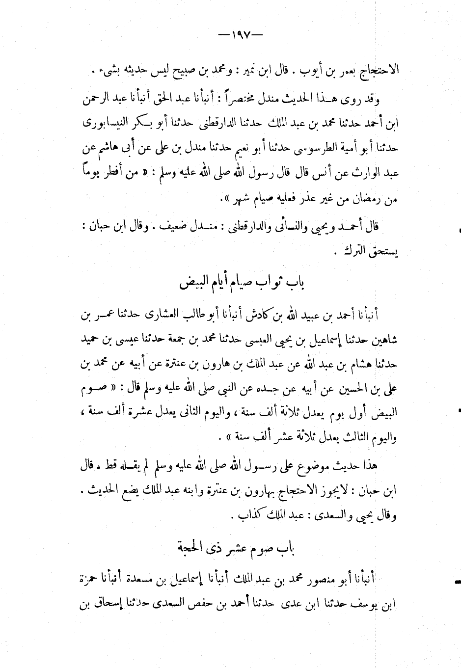 بَاب صَوْم عشر ذى الْحجَّة أَنْبَأَنَا أَبُو مَنْصُورٍ مُحَمَّدُ بْنُ عبد الملك أَنْبَأَنَا إِسْمَاعِيلُ بْنُ مَسْعَدَةَ أَنْبَأَنَا حَمْزَة ابْن يُوسُفَ حَدَّثَنَا ابْنُ عَدِيٍّ حَدَّثَنَا أَحْمَدُ بْنُ حَفْصٍ السَّعْدِيُّ حَدَّثَنَا إِسْحَاق بن