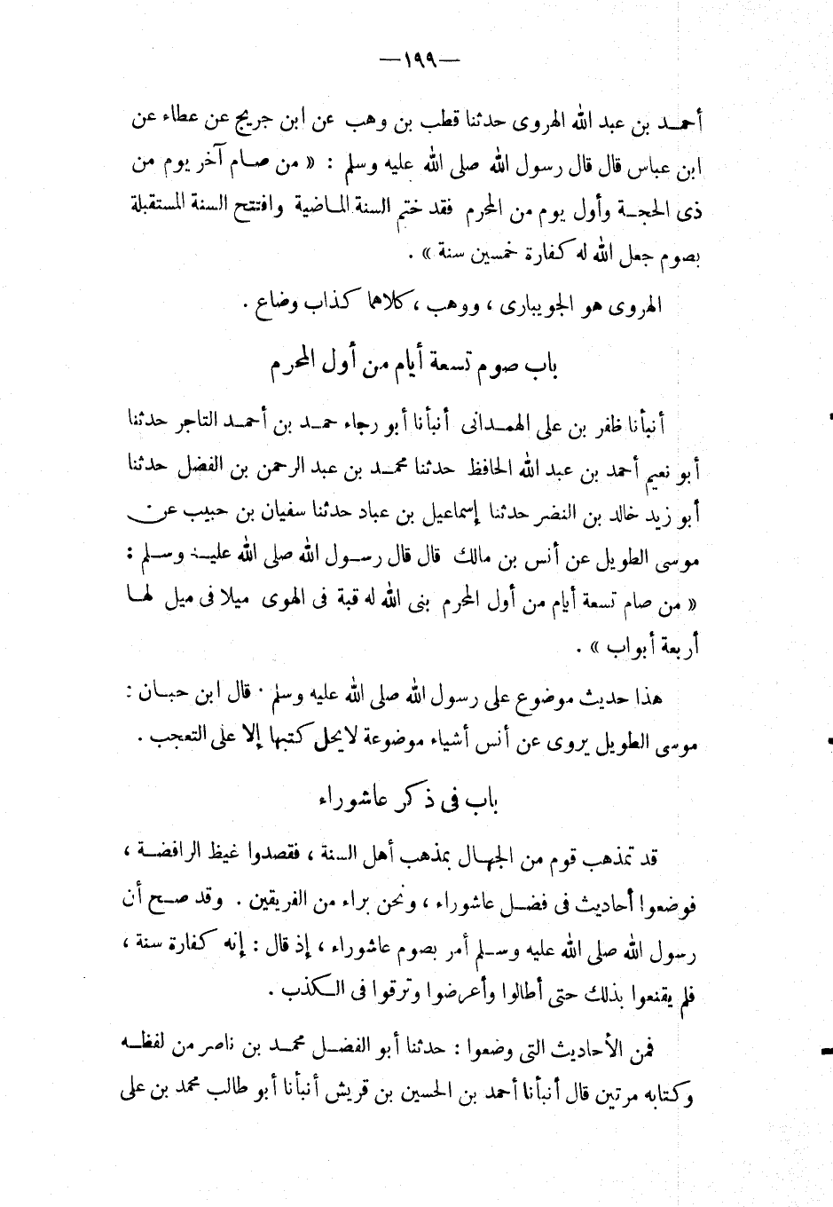 بَاب فِي ذكر عَاشُورَاءَ قَدْ تمذهب قوم من الْجُهَّال بِمذهب أَهْل السّنة، فقصدوا غيظ الرافضة، فوضعوا أَحَادِيث فِي فضل عَاشُورَاءَ، وَنحن برَاء من الْفَرِيقَيْنِ.