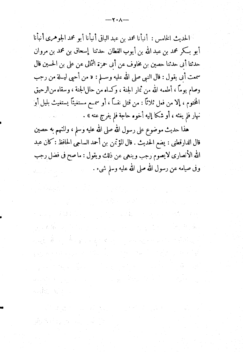 الحَدِيث الْخَامِس: أَنْبَأَنَا مُحَمَّدُ بْنُ عَبْدِ الْبَاقِي أَنْبَأَنَا أَبُو مُحَمَّدٍ الْجَوْهَرِيُّ أَنْبَأَنَا أَبُو بَكْرٍ مُحَمَّدُ بن عبد الله بْنِ أَيُّوبَ الْقَطَّانُ حَدَّثَنَا إِسْحَاقُ بْنُ مُحَمَّدِ بْنِ مَرْوَانَ حَدَّثَنَا أَبِي حَدَّثَنَا حُصَيْنُ بْنُ مُخَاوِفٍ عَنْ أَبِي حَمْزَةَ الثُّمَالِيِّ عَنْ عَلِيِّ بْنِ الْحُسَيْنِ قَالَ سَمِعْتُ أَبِي يَقُولُ: قَالَ النَّبِيُّ صَلَّى الله عَلَيْهِ وَسلم: " من أحيى لَيْلَةً مِنْ رَجَبٍ وَصَامَ يَوْمًا، أَطْعَمَهُ اللَّهُ مِنْ ثِمَارِ الْجَنَّةِ، وَكَسَاهُ مِنْ حُلَلِ الْجَنَّةِ، وَسَقَاهُ مِنَ الرَّحِيقِ الْمَخْتُومِ، إِلا مَنْ فَعَلَ ثَلاثًا: مَنْ قَتَلَ نَفْسًا، أَوْ سَمِعَ مُسْتَغِيثًا يَسْتَغِيثُ بِلَيْلٍ أَوْ نَهَارٍ فَلَمْ يُغِثْهُ، أَوْ شَكَا إِلَيْهِ أَخُوهُ حَاجَةً فَلَمْ يُفِرَّجْ عَنْهُ ".