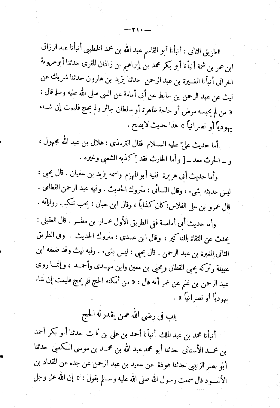 الطَّرِيق الثَّانِي: أَنْبَأَنَا أَبُو الْقَاسِمِ عبد الله بْنُ مُحَمَّدٍ الْخَطِيبِيُّ أَنْبَأَنَا عَبْدُ الرَّزَّاق ابْن عُمَرَ بْنِ شَمَّةَ أَنْبَأَنَا أَبُو بَكْرٍ مُحَمَّدُ بْنُ إِبْرَاهِيمَ بْنِ زَاذَانَ الْمُقْرِي حَدَّثَنَا أَبُو عَرُوبَةَ الحرانى أَنبأَنَا الْمُغيرَة بن عبد الرحمن حَدَّثَنَا يَزِيدُ بْنُ هَارُونَ حَدَّثَنَا شريك عَن لَيْث عَن عبد الرحمن بْنِ سَابِطٍ عَنْ أَبِي أُمَامَةَ عَن النَّبِي صَلَّى اللَّهُ عَلَيْهِ وَسَلَّمَ قَالَ: " مَنْ لَمْ يَحْبِسْهُ مَرَضٌ أَوْ حَاجَةٌ ظَاهِرَةٌ أَوْ سُلْطَانٌ جَائِرٌ وَلَمْ يَحُجَّ فَلْيَمُتْ إِنْ شَاءَ يَهُودِيًّا أَوْ نَصْرَانِيًّا " هَذَا حَدِيثٌ لَا يَصِحُّ.