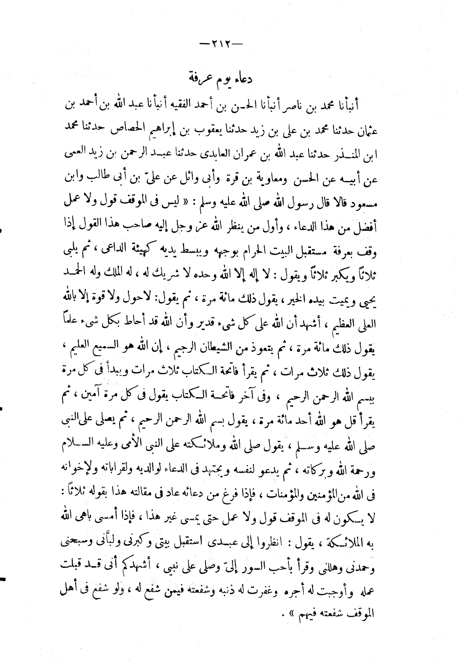 دُعَاء يَوْم عَرَفَة أَنْبَأَنَا مُحَمَّدُ بْنُ نَاصِرٍ أَنْبَأَنَا الْحَسَنُ بْنُ أَحْمَدَ الْفَقِيهُ أَنْبَأَنَا عبد الله بْنُ أَحْمَدَ بْنِ عُثْمَانَ حَدَّثَنَا مُحَمَّدُ بْنُ عَلِيِّ بْنِ زَيْدٍ حَدَّثَنَا يَعْقُوبُ بْنُ إِبْرَاهِيمَ الْحُصَاصُ حَدثنَا مُحَمَّد ابْن الْمُنْذر حَدثنَا عبد الله بن عمرَان العابدى حَدثنَا عبد الرحمن بْنُ زَيْدٍ الْعَمِّيِّ عَنْ أَبِيهِ عَنِ الْحَسَنِ ومُعَاوِيَةَ بْنِ قُرَّةَ وَأَبِي وَائِلٍ عَنْ عَلِيِّ بْنِ أَبِي طَالِبٍ وَابْنِ مَسْعُودٍ قَالا قَالَ رَسُول الله صَلَّى اللَّهُ عَلَيْهِ وَسَلَّمَ: " لَيْسَ فِي الْمَوْقِفِ قَوْلٌ وَلا عَمَلٌ أَفْضَلَ مِنْ هَذَا الدُّعَاءِ، وَأَوَّلُ مَنْ يَنْظُرُ الله عزوجل إِلَيْهِ صَاحِبُ هَذَا الْقَوْلِ إِذَا وَقَفَ بِعَرَفَةَ مُسْتِقْبِلَ الْبَيْتِ الْحَرَامِ بِوَجْهِهِ وَيَبْسُطُ يَدَيْهِ كَهَيْئَةِ الدَّاعِي، ثُمَّ يُلَبِّي ثَلاثًا وَيُكَبِّرُ ثَلاثًا وَيَقُولُ: لَا إِلَهَ إِلا اللَّهُ وَحْدَهُ لَا شَرِيكَ لَهُ، لَهُ الْمُلْكُ وَلَهُ الْحَمْدُ يُحْيِي وَيُمِيتُ بِيَدِهِ الْخَيْرُ، يَقُولُ ذَلِكَ مِائَة مَرَّةٍ، ثُمَّ يَقُولُ: لَا حَوْلَ وَلا قُوَّةَ إِلا بِاللَّهِ الْعَلِيِّ الْعَظِيمِ، أَشْهَدُ أَنَّ اللَّهَ عَلَى كل شئ قَدِيرٌ وَأَنَّ اللَّهَ قَدْ أَحَاطَ بِكُل شئ عِلْمًا يَقُولُ ذَلِكَ مِائَةَ مَرَّةٍ، ثُمَّ يَتَعَوَّذُ مِنَ الشَّيْطَانِ الرِّجَيمِ، إِنَّ اللَّهَ هُوَ السَّمِيعُ الْعَلِيمُ، يَقُولُ ذَلِكَ ثَلاثَ مَرَّاتٍ، ثُمَّ يَقْرَأُ فَاتِحَةَ الْكِتَابِ ثَلاثَ مَرَّاتٍ وَيَبْدَأُ فِي كُلِّ مَرَّةٍ بِبِسْمِ اللَّهِ الرَّحْمَنِ الرَّحِيمِ، وَفِي آخِرِ فَاتِحَةِ الْكِتَابِ يَقُولُ فِي كُلِّ مَرَّةٍ آمِينَ، ثُمَّ يَقْرَأُ قُلْ هُوَ اللَّهُ أَحَدٌ مِائَة مَرَّةٍ، يَقُولُ بِسْمِ اللَّهِ الرَّحْمَنِ الرَّحِيمِ، ثُمَّ يُصَلِّي عَلَى النَّبِيِّ صَلَّى اللَّهُ عَلَيْهِ وَسَلَّمَ، يَقُولُ صَلَّى اللَّهُ وَمَلائِكَتُهُ عَلَى النَّبِيِّ الأُمِّيِّ وَعَلَيْهِ السَّلامُ