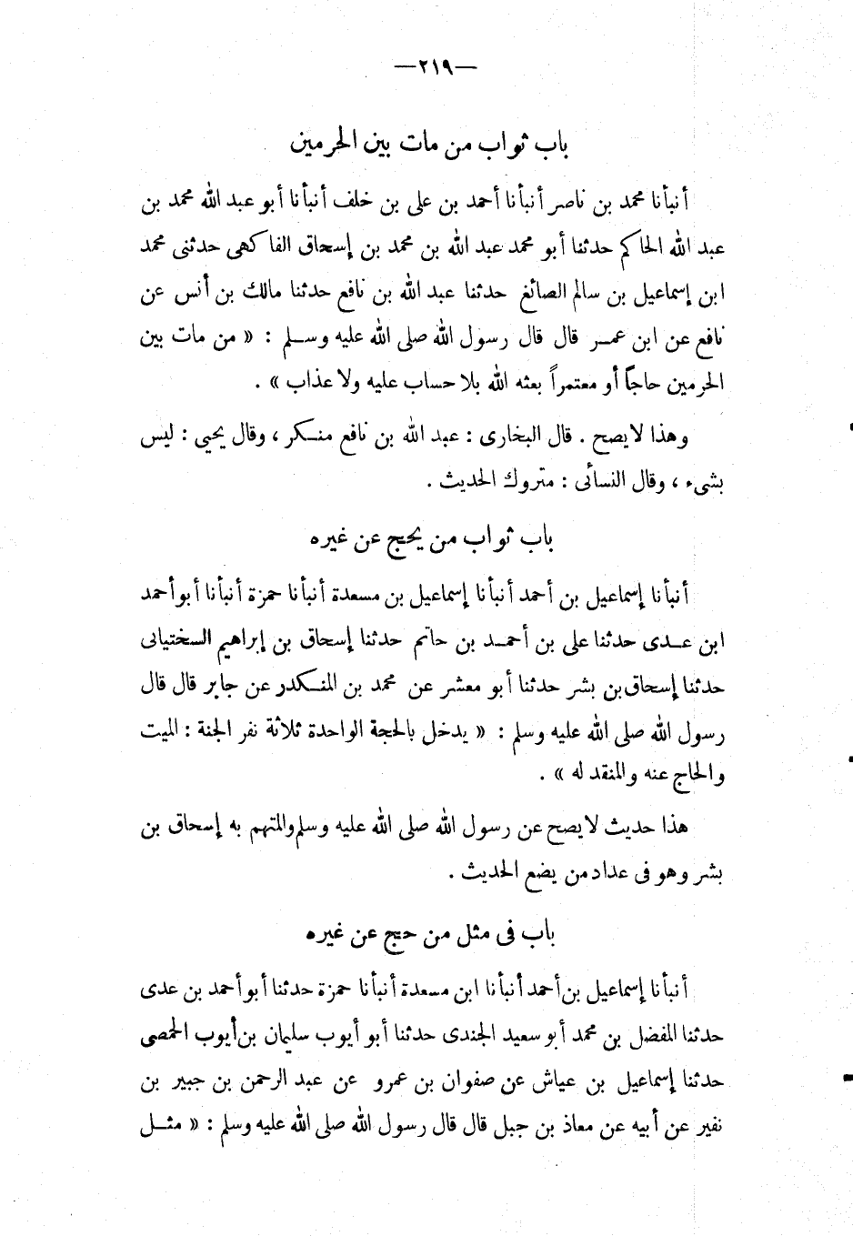 بَاب ثَوَاب من مَاتَ بَين الْحَرَمَيْنِ أَنْبَأَنَا مُحَمَّدُ بْنُ نَاصِرٍ أَنْبَأَنَا أَحْمد بن عَليّ بن خلف أَنبأَنَا أَبُو عبد الله مُحَمَّد بن عبد الله الْحَاكِم حَدثنَا أَبُو مُحَمَّد عبد الله بْنُ مُحَمَّدِ بْنِ إِسْحَاقَ الْفَاكِهِيُّ حَدَّثَنى مُحَمَّد ابْن إِسْمَاعِيلَ بْنِ سَالِمٍ الصَّائِغُ حَدَّثَنَا عبد الله بْنُ نَافِعٍ حَدَّثَنَا مَالِكُ بْنُ أَنَسٍ عَنْ نَافِع عَنِ ابْنِ عُمَرَ قَالَ قَالَ رَسُولُ اللَّهِ صَلَّى اللَّهُ عَلَيْهِ وَسَلَّمَ: " من مَاتَ بَيْنَ الْحَرَمَيْنِ حَاجًّا أَوْ مُعْتَمِرًا بَعَثَهُ اللَّهُ بِلا حِسَابٍ عَلَيْهِ وَلا عَذَابٍ ".
