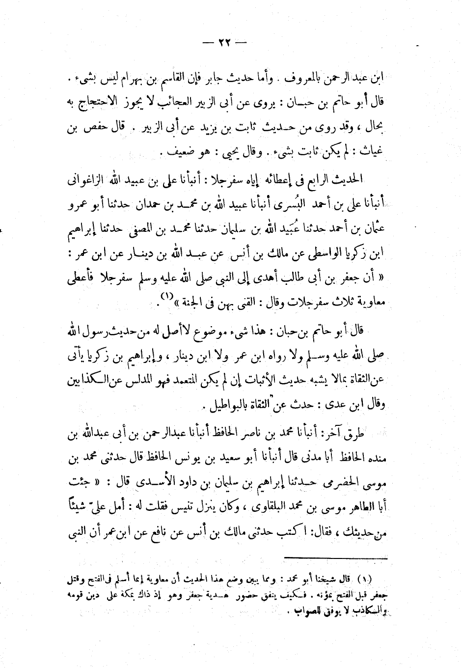 (1) قَالَ شَيخنَا أَبُو مُحَمَّد: وَمِمَّا يبين وضع هَذَا الحَدِيث أَن مُعَاوِيَة إِنَّمَا أسلم فِي الْفَتْح وَقتل جَعْفَر قيل الْفَتْح بمؤته.