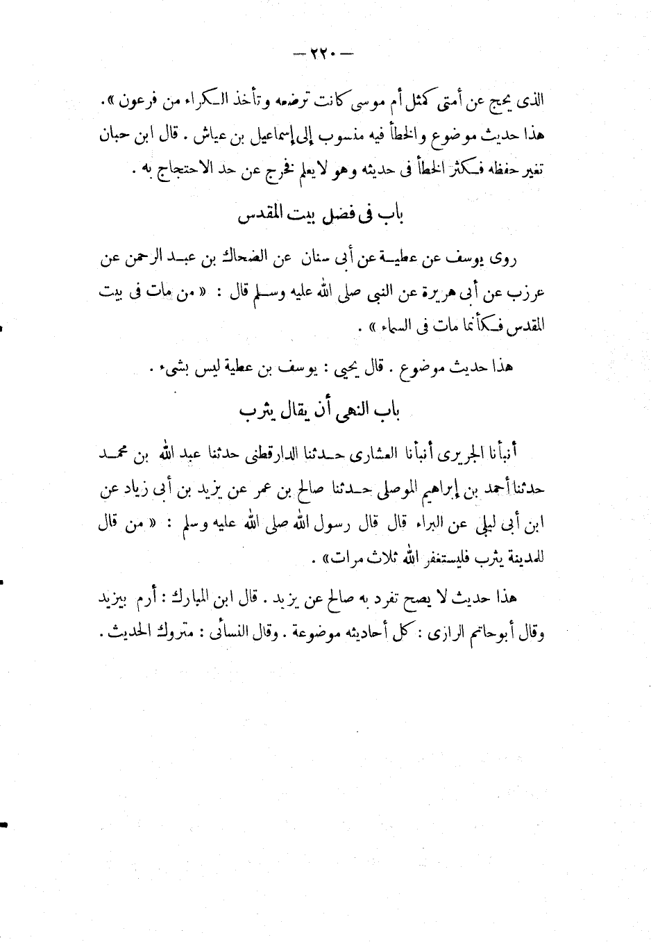 أَنْبَأَنَا الْجُرَيْرِيُّ أَنْبَأَنَا الْعُشَارِيُّ حَدَّثَنَا الدَّارَقُطْنِيّ حَدثنَا عبد الله بْنُ مُحَمَّدٍ حَدَّثَنَا أَحْمَدُ بْنُ إِبْرَاهِيمَ الْمَوْصِلِيُّ حَدَّثَنَا صَالِحُ بْنُ عُمَرَ عَنْ يَزِيدَ بْنِ أَبِي زِيَاد عَنِ ابْنِ أَبِي لَيْلَى عَن الْبَراء قَالَ قَالَ رَسُول الله صَلَّى اللَّهُ عَلَيْهِ وَسَلَّمَ: " مَنْ قَالَ لِلْمَدِينَةِ يَثْرِبَ فَلْيَسْتَغْفِرِ اللَّهَ ثَلاثَ مَرَّاتٍ ".