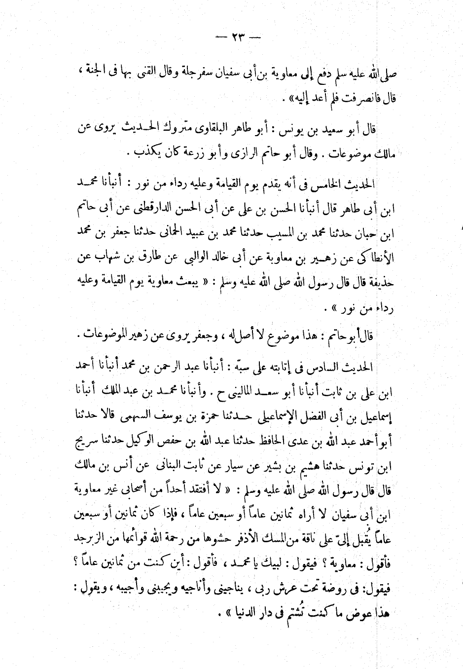 ابْن أَبِي طَاهِرٍ قَالَ أَنْبَأَنَا الْحَسَنُ بْنُ عَلِيٍّ عَنْ أَبِي الْحُسَنِ الدَّارَقُطْنِيّ عَن أَبى حَاتِم ابْن حِبَّانَ حَدَّثَنَا مُحَمَّدُ بْنُ الْمُسَيِّبِ حَدَّثَنَا مُحَمَّدُ بْنُ عُبَيْدٍ الْحِمَّانِيُّ حَدَّثَنَا جَعْفَرُ بْنُ مُحَمَّدٍ الأَنْطَاكِيُّ عَنْ زُهَيْرِ بْنِ مُعَاوِيَةَ عَنْ أَبِي خَالِدٍ الْوَالِبِيِّ عَنْ طَارِقِ بْنِ شِهَابٍ عَنْ حُذَيْفَةَ قَالَ قَالَ رَسُول الله صَلَّى اللَّهُ عَلَيْهِ وَسَلَّمَ: " يُبْعَثُ مُعَاوِيَةُ يَوْمَ الْقِيَامَةِ وَعَلَيْهِ رِدَاء مِنْ نُورٍ ".