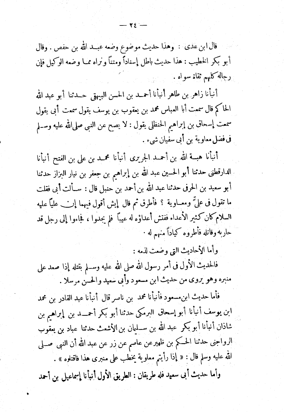فَأَما حَدِيث ابْن مَسْعُود فَأَنْبَأَنَا مُحَمَّدُ بْنُ نَاصِرٍ قَالَ أَنْبَأَنَا عبد الْقَادِر بن مُحَمَّد ابْن يُوسُفَ أَنْبَأَنَا أَبُو إِسْحَاقَ الْبَرْمَكِيُّ حَدَّثَنَا أَبُو بَكْرٍ أَحْمَدُ بْنُ إِبْرَاهِيمَ بْنِ شَاذَانَ أَنْبَأَنَا أَبُو بكر عبد الله بْنُ سُلَيْمَانَ بْنِ الأَشْعَثِ حَدَّثَنَا عَبَّادُ بْنُ يَعْقُوبَ الرَّوَاجِنِيُّ حَدَّثَنَا الْحَكَمُ بْنُ ظُهَيْرٍ عَنْ عَاصِمٍ عَن زر عَن عبد الله إِن النَّبِي صَلَّى اللَّهُ عَلَيْهِ وَسَلَّمَ قَالَ: " إِذَا رَأَيْتُمْ مُعَاوِيَةَ يَخْطُبُ عَلَى مِنْبَرِي هَذَا فَاقْتُلُوهُ ".