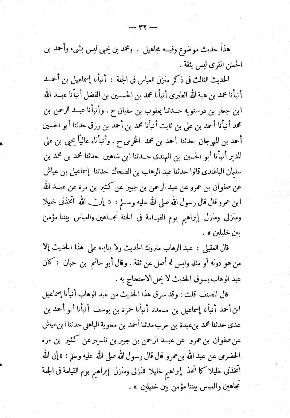 الحَدِيث الثَّالِث فِي ذكر منزل الْعَبَّاسِ فِي الْجَنَّةِ: أَنْبَأَنَا إِسْمَاعِيلُ بْنُ أَحْمَدَ أَنْبَأَنَا مُحَمَّدُ بْنُ هِبَةِ اللَّهِ الطَّبَرِيُّ أَنْبَأَنَا مُحَمَّدُ بْنُ الْحُسَيْن بن الْفضل أَنبأَنَا عبد الله ابْن جَعْفَرِ بْنِ دُرَسْتَوَيْهِ حَدَّثَنَا يَعْقُوبُ بن سُفْيَان ح.