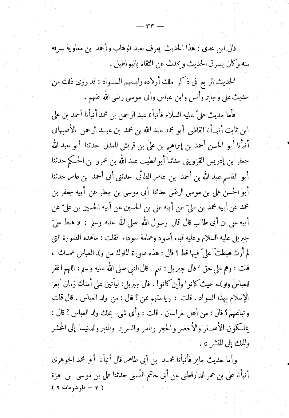 فَأَما حَدِيث على عَلَيْهِ السَّلَام فأنبأنا عبد الرحمن بْنُ مُحَمَّدٍ أَنْبَأَنَا أَحْمَدُ بْنُ على ابْن ثَابِتٍ أَنْبَأَنَا الْقَاضِي أَبُو مُحَمَّدٍ عبد الله بن مُحَمَّد بن عبد الرحمن الأَصْبَهَانِيُّ أَنْبَأَنَا أَبُو الْحَسَنِ أَحْمَدُ بْنُ إِبْرَاهِيمَ بْنِ عَلِيِّ بْنِ قُرَيْشٍ الْمُعَدَّلُ حَدَّثَنَا أَبُو عَبْدِ اللَّهِ جَعْفَرُ بْنُ إِدْرِيسَ الْقَزْوِينِيُّ حَدثنَا أَبُو الطّيب عبد الله بْنُ عَمْرِو بْنِ الْحَكَمِ حَدَّثَنَا أَبُو الْقَاسِم عبد الله بْنُ أَحْمَدَ بْنِ عَامِرٍ الطَّائِيُّ حَدَّثَنِي أَبِي أَحْمَدُ بْنُ عَامِرٍ حَدَّثَنَا أَبُو الْحَسَنِ عَلِيُّ بْنُ مُوسَى الرَّضِيُّ حَدَّثَنَا أَبِي مُوسَى بْنُ جَعْفَرٍ عَنْ أَبِيهِ جَعْفَرِ بْنِ مُحَمَّدٍ عَنْ أَبِيهِ مُحَمَّدِ بْنِ عَلِيٍّ عَنْ أَبِيهِ عَلِيِّ بْنِ الْحُسَيْنِ عَنْ أَبِيهِ الْحُسَيْنِ بْنِ عَلِيٍّ عَنْ أَبِيهِ عَلِيِّ بْنِ أَبِي طَالِبٍ قَالَ قَالَ رَسُول الله صَلَّى اللَّهُ عَلَيْهِ وَسَلَّمَ: " هَبَطَ عَلَيَّ جِبْرِيلُ عَلَيْهِ السَّلامُ وَعَلَيْهِ قَبَاءٌ أَسْوَدُ وَعِمَامَةٌ سَوْدَاءُ فَقُلْتُ: مَا هَذهِ الصُّورَةُ الَّتِي لَمْ أَرَكَ هَبَطْتَ عَلَيَّ فِيهَا قَطُّ؟ قَالَ: هَذهِ صُورَةُ الْمُلُوكِ مِنْ وَلَدِ الْعَبَّاسِ عَمِّكَ، قُلْتُ: وَهُمْ عَلَى حَقٍّ؟ قَالَ جِبْرِيلُ: نَعَمْ.