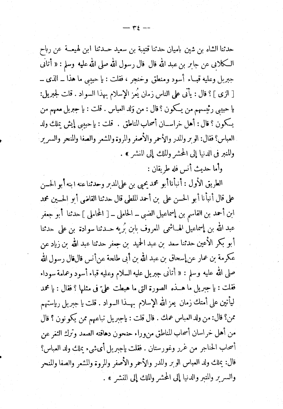 حَدَّثَنَا الشَّاهُ بْنُ شِينَ بَاميانَ حَدَّثَنَا قُتَيْبَةُ بْنُ سَعِيدٍ حَدَّثَنَا ابْنُ لَهِيعَةَ عَنْ رَبَاحٍ الْكِلابِيِّ عَن جَابر بن عبد الله قَالَ قَالَ رَسُول الله صَلَّى اللَّهُ عَلَيْهِ وَسَلَّمَ: " أَتَانِي جِبْرِيلُ وَعَلَيْهِ قَبَاءٌ أَسْوَدُ وَمَنْطِقٌ وَخِنْجِرٌ، فَقُلْتُ: يَا حَبِيبِي مَا هَذَا - الذى -[الزِّيُّ] ؟ قَالَ: يَأْتِي عَلَى النَّاسِ زَمَانٌ يُعَزُّ الإِسْلامُ بِهَذَا السَّوَادِ.