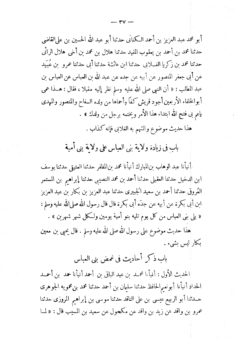 بَاب فِي زِيَادَة ولَايَة بَنِي الْعَبَّاسِ على ولَايَة بنى أُميَّة أَنبأَنَا عبد الْوَهَّاب بن الْمُبَارك أَنْبَأَنَا مُحَمَّدُ بْنُ الْمُظَفَّرِ حَدَّثَنَا العتيقي حَدثنَا يُوسُف ابْنُ الدَّخِيلِ حَدَّثَنَا الْعَقِيلِيُّ حَدَّثَنَا أَحْمَدُ بْنُ مُحَمَّدٍ النَّصِيبِيُّ حَدَّثَنَا إِبْرَاهِيمُ بْنُ الْمُسْتِمِرُّ