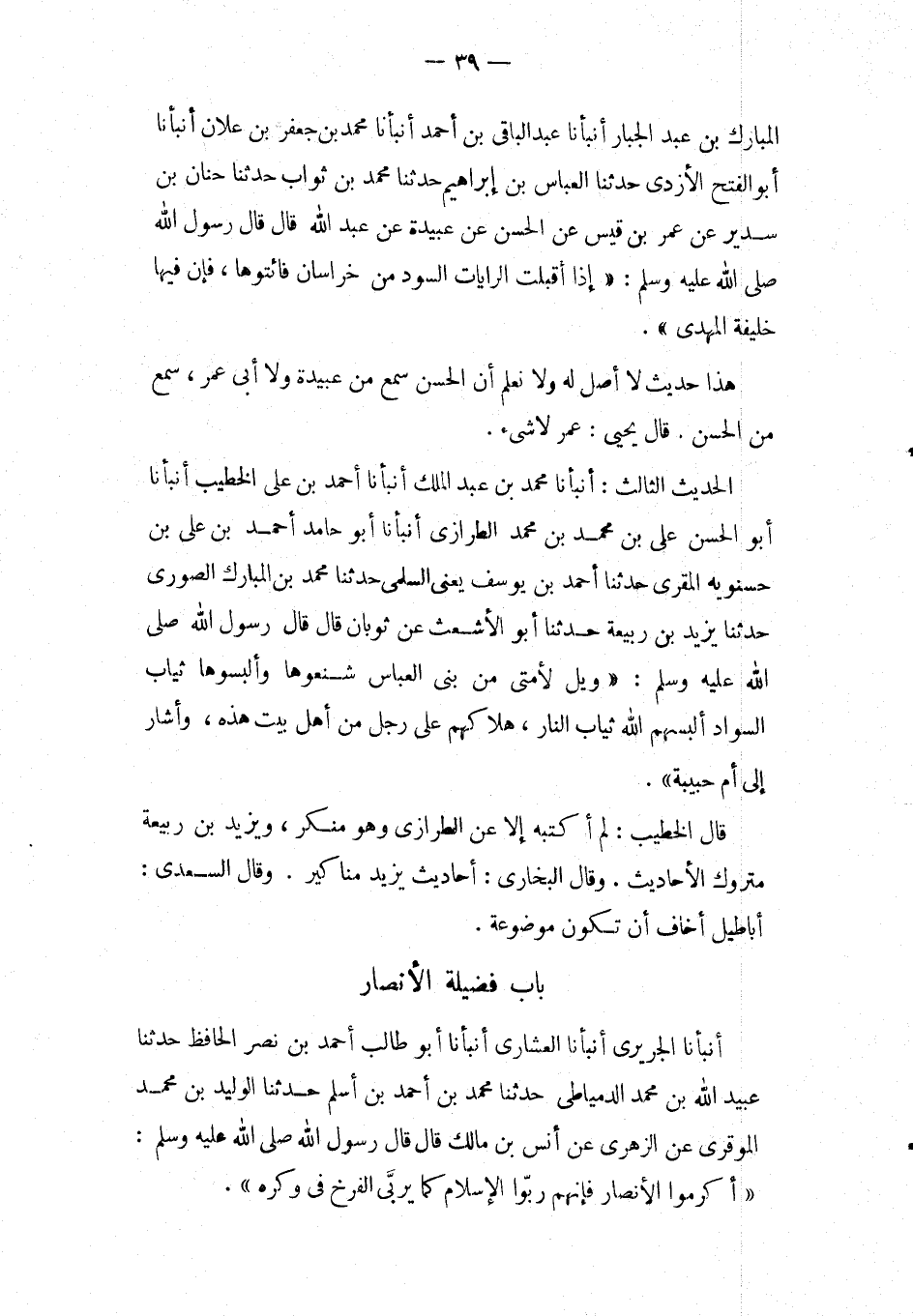 الْمُبَارَكُ بْنُ عَبْدِ الْجَبَّارِ أَنْبَأَنَا عَبْدُ الْبَاقِي بْنُ أَحْمَدَ أَنْبَأَنَا مُحَمَّد بن جَعْفَر بن عَلان أَنْبَأَنَا أَبُو الْفَتْحِ الأَزْدِيُّ حَدَّثَنَا الْعَبَّاسُ بْنُ إِبْرَاهِيمَ حَدَّثَنَا مُحَمَّدُ بْنُ ثَوَابٍ حَدَّثَنَا حَنَانُ بْنُ سَدِيرٍ عَنْ عُمَرَ بْنِ قَيْسٍ عَنِ الْحَسَنِ عَنْ عُبَيْدَةَ عَنْ عبد الله قَالَ قَالَ رَسُول الله صَلَّى اللَّهُ عَلَيْهِ وَسَلَّمَ: " إِذَا أَقْبَلَتِ الرَّايَاتُ السُّودُ مِنْ خُرَاسَانَ فَائْتُوهَا، فَإِنَّ فِيهَا خَلِيفَةَ الْمَهْدِيِّ ".