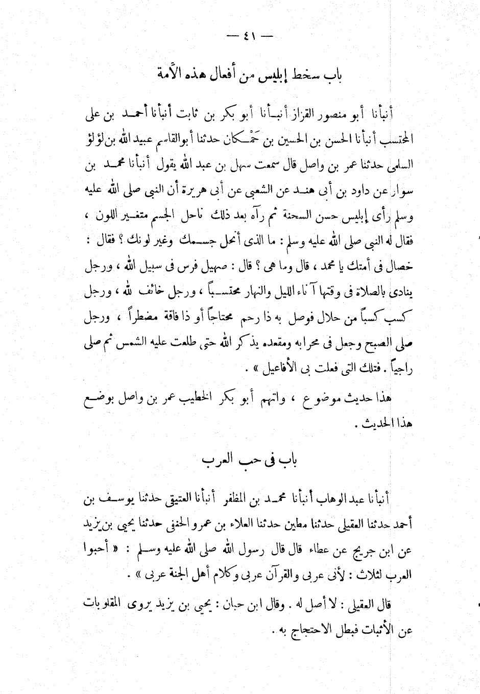 بَاب سخط إِبْلِيس من أَفعَال هَذهِ الامة أَنْبَأَنَا أَبُو مَنْصُورٍ الْقَزَّازُ أَنْبَأَنَا أَبُو بَكْرِ بْنُ ثَابِتٍ أَنْبَأَنَا أَحْمَدُ بْنُ عَلِيٍّ الْمُحْتَسِبُ أَنْبَأَنَا الْحَسَنُ بْنُ الْحُسَيْنِ بْنِ حَمْكَانَ حَدثنَا أَبُو الْقَاسِم عبيد الله بْنُ لُؤْلُؤٍ السُّلَمِيُّ حَدَّثَنَا عُمَرُ بْنُ وَاصِلٍ قَالَ سَمِعْتُ سَهْلَ بن عبد الله يَقُولُ أَنْبَأَنَا مُحَمَّدُ بْنُ سَوَّارِ عَنْ دَاوُدَ بْنِ أَبِي هِنْدٍ عَنِ الشَّعْبِيِّ عَنْ أَبِي هُرَيْرَةَ إِن النَّبِي صَلَّى اللَّهُ عَلَيْهِ وَسَلَّمَ رَأَى إِبْلِيسَ حَسَنَ السِّحْنَةِ ثُمَّ رَآهُ بَعْدَ ذَلِكَ نَاحِلَ الْجِسْمِ مُتَغَيِّرَ اللَّوْنِ، فَقَالَ لَهُ النَّبِي صَلَّى اللَّهُ عَلَيْهِ وَسَلَّمَ: مَا الَّذِي أَنْحَلَ جِسْمَكَ وَغَيَّرَ لَوْنَكَ؟ فَقَالَ: خِصَالٌ فِي أُمَّتِكَ يَا مُحَمَّدُ، قَالَ وَمَا هِيَ؟ قَالَ: صَهِيلُ فَرَسٍ فِي سَبِيلِ اللَّهِ، وَرَجُلٌ