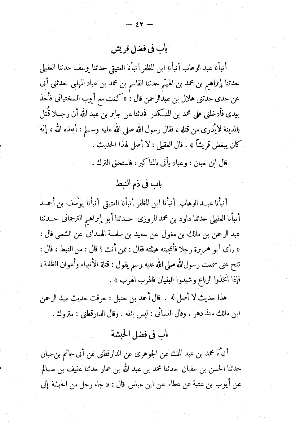بَاب فِي فضل قُرَيْش أَنْبَأَنَا عَبْدُ الْوَهَّابِ أَنْبَأَنَا ابْنُ الْمُظَفَّرِ أَنْبَأَنَا الْعَتِيقِيُّ حَدَّثَنَا يُوسُفُ حَدَّثَنَا الْعَقِيلِيُّ حَدَّثَنَا إِبْرَاهِيمُ بْنُ مُحَمَّدِ بْنِ الْهَيْثَمِ حَدَّثَنَا الْقَاسِمُ بْنُ مُحَمَّدِ بْنِ عَبَّادٍ الْمُهلَّبِيُّ حَدَّثَنِي أَبِي عَنْ جَدِّي حَدَّثَنِي هِلَال بن عبد الرحمن قَالَ: " كُنْتُ مَعَ أَيُّوبَ السِّخْتِيَانِيِّ فَأَخَذَ بِيَدِي فَأَدْخَلَنِي عَلَى مُحَمَّدِ بْنِ الْمُنْكَدِرِ فَحَدَّثَنَا عَنْ جَابِرِ بن عبد الله أَنَّ رَجُلا قُتِلَ بِالْمَدِينَةِ لَا يُدْرَى مَنْ قَتَلَهُ، فَقَالَ رَسُولُ الله صَلَّى اللَّهُ عَلَيْهِ وَسَلَّمَ: أَبْعَدَهُ اللَّهُ، إِنَّهُ كَانَ يُبْغِضُ قُرَيْشًا ".