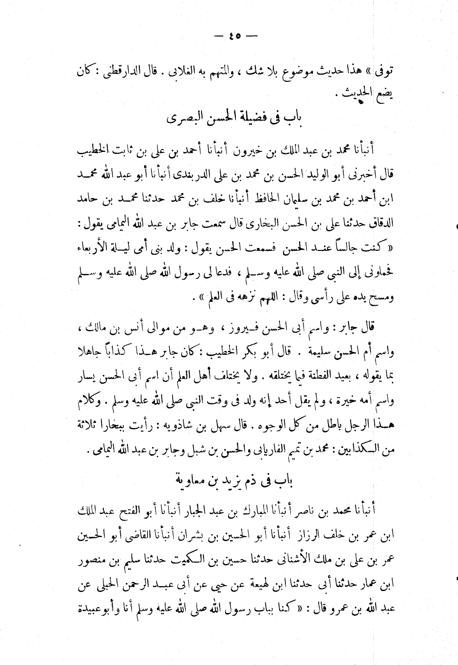بَاب فِي فَضِيلَة الْحسن الْبَصْرِيّ أَنبأَنَا مُحَمَّد بن عبد الملك بْنِ خَيْرُونٍ أَنْبَأَنَا أَحْمَدُ بْنُ عَلِيِّ بْنِ ثَابِتٍ الْخَطِيبُ قَالَ أَخْبَرَنِي أَبُو الْوَلِيدِ الْحَسَنُ بْنُ مُحَمَّدِ بْنِ عَلِيٍّ الدَّرَبَنْدِيُّ أَنْبَأَنَا أَبُو عبد الله مُحَمَّد ابْن أَحْمَدَ بْنِ مُحَمَّدِ بْنِ سُلَيْمَانَ الْحَافِظُ أَنْبَأَنَا خَلَفُ بْنُ مُحَمَّدٍ حَدَّثَنَا مُحَمَّدُ بْنُ حَامِدٍ الدَّقَّاقُ حَدَّثَنَا عَلِيُّ بْنُ الْحَسَنِ الْبُخَارِيُّ قَالَ سَمِعت جَابر بن عبد الله الْيَمَامِيَّ يَقُولُ: