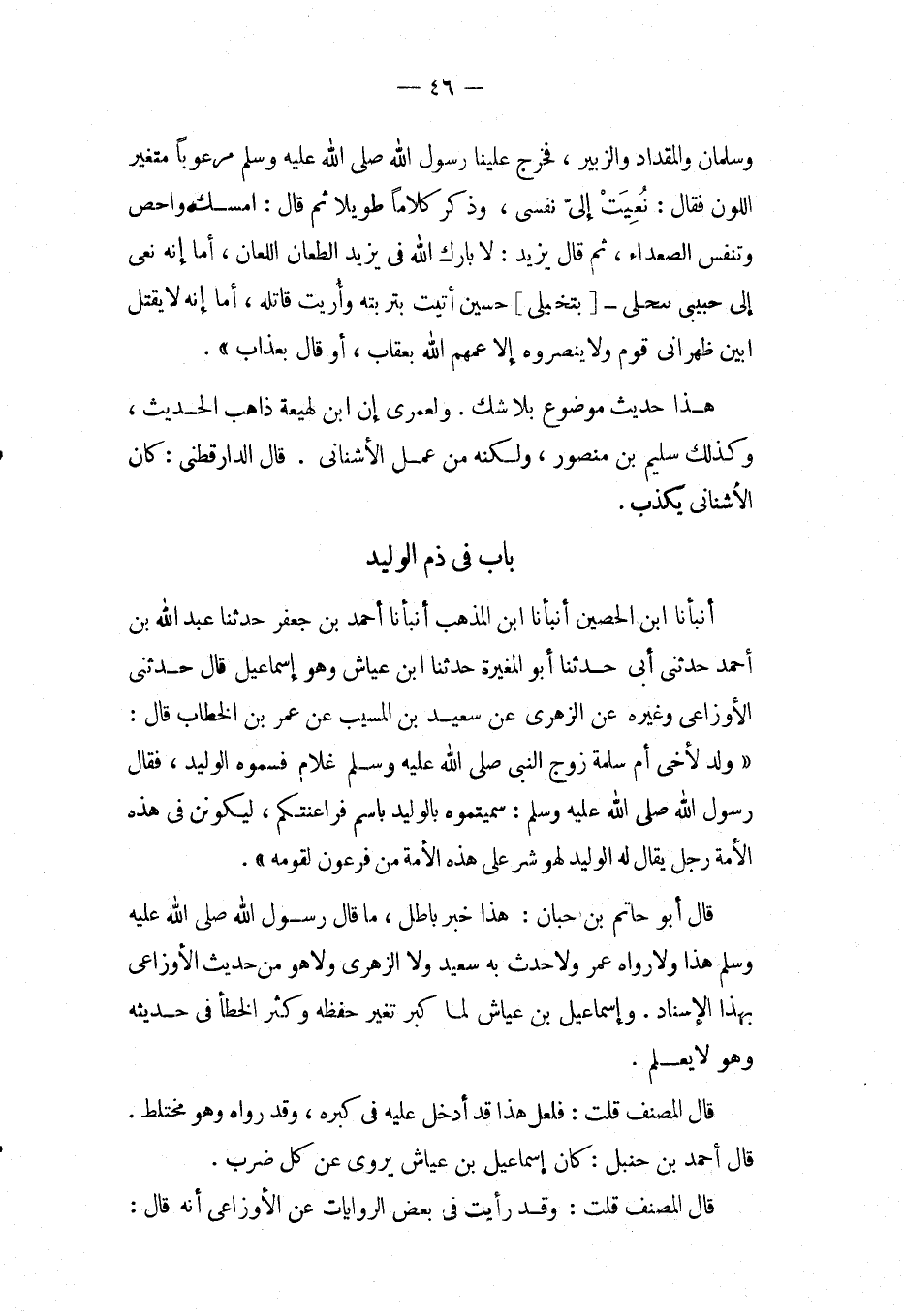 بَاب فِي ذمّ الْوَلِيد أَنْبَأَنَا ابْنُ الْحُصَيْنِ أَنْبَأَنَا ابْنُ الْمُذْهِبِ أَنْبَأَنَا أَحْمَدُ بْنُ جَعْفَرٍ حَدثنَا عبد الله بْنُ أَحْمَدَ حَدَّثَنِي أَبِي حَدَّثَنَا أَبُو الْمُغِيرَةِ حَدَّثَنَا ابْنُ عَيَّاشٍ وَهُوَ إِسْمَاعِيلُ قَالَ حَدَّثَنِي الَأَوْزَاعِيُّ وَغَيْرُهُ عَنِ الزُّهْرِيِّ عَنْ سَعِيدِ بْنِ الْمُسَيِّبِ عَنْ عُمَرَ بْنِ الْخَطَّابِ قَالَ: " وُلِدُ لأَخِي أُمِّ سَلَمَةَ زَوْجِ النِّبِيِّ صَلَّى اللَّهُ عَلَيْهِ وَسَلَّمَ غُلامٌ فَسَمَّوْهُ الْوَلِيدَ، فَقَالَ رَسُول الله صَلَّى اللَّهُ عَلَيْهِ وَسَلَّمَ: سَمَّيْتُمُوهُ بِالْوَلِيدِ بِاسْمِ فَرَاعِنَتِكُمْ، لَيَكُونَنَّ فِي هَذِهِ الأُمَّةِ رَجُلٌ يُقَالُ لَهُ الْوَلِيدُ لَهُوَ شَرٌّ عَلَى هَذِهِ الأُمَّةِ مِنْ فِرْعَوْنَ لِقَوْمِهِ ".