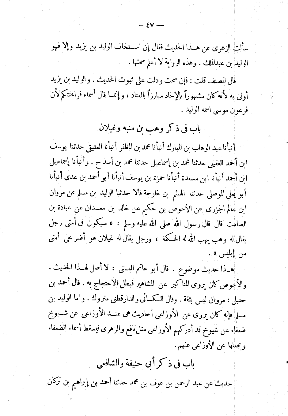 بَاب فِي ذكر وَهْب بْن مُنَبّه وغيلان أَنبأَنَا عبد الْوَهَّاب بن الْمُبَارك أَنْبَأَنَا مُحَمَّدُ بْنُ الْمُظَفَّرِ أَنْبَأَنَا العتيقي حَدثنَا يُوسُف ابْن أَحْمَدَ الْعَقِيلِيُّ حَدَّثَنَا مُحَمَّدُ بْنُ إِسْمَاعِيلَ حَدَّثَنَا مُحَمَّدُ بْنُ أَسَدٍ ح.