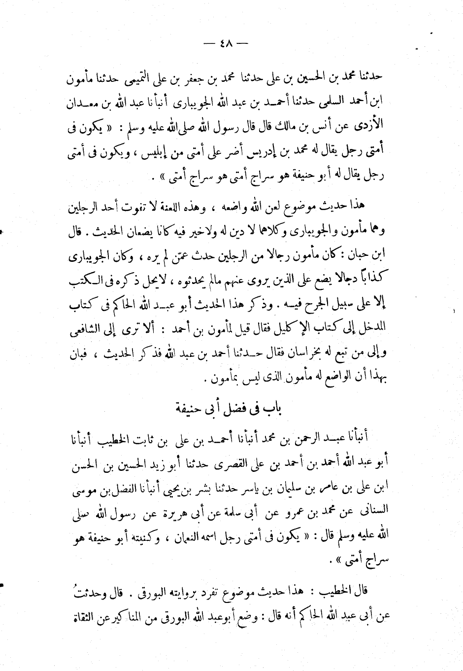 بَاب فِي فضل أَبِي حَنِيفَةَ أَنْبَأَنَا عبد الرحمن بْنُ مُحَمَّدٍ أَنْبَأَنَا أَحْمَدُ بْنُ عَلِيِّ بْنِ ثَابِتٍ الْخَطِيبُ أَنْبَأَنَا أَبُو عَبْدِ اللَّهِ أَحْمَدُ بْنُ أَحْمَدَ بْنِ عَلِيٍّ الْقَصَرِيُّ حَدَّثَنَا أَبُو زَيْدٍ الْحُسَيْنُ بْنُ الْحَسَنِ ابْن عَلِيِّ بْنِ عَامِرِ بْنِ سُلَيْمَانَ بْنِ يَاسِرٍ حَدَّثَنَا بِشْرُ بْنُ يَحْيَى أَنْبَأَنَا الْفَضْلُ بْنُ مُوسَى السِّنَانِيُّ عَنْ مُحَمَّدِ بْنِ عَمْرٍو عَنْ أَبِي سَلَمَةَ عَنْ أَبِي هُرَيْرَةَ عَنْ رَسُولِ اللَّهِ صَلَّى اللَّهُ عَلَيْهِ وَسَلَّمَ قَالَ: " يَكُونُ فِي أُمَّتِي رَجُلٌ اسْمُهُ النُّعْمَانُ، وَكُنْيَتُهُ أَبُو حَنِيفَةَ هُوَ سِرَاجُ أُمَّتِي ".
