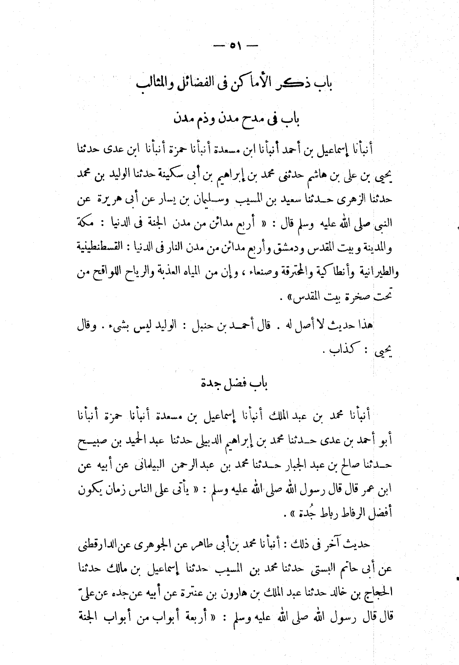 يَحْيَى بْنُ عَلِيِّ بْنِ هَاشِمٍ حَدَّثَنِي مُحَمَّدُ بْنُ إِبْرَاهِيمَ بْنِ أَبِي سَكِينَةَ حَدَّثَنَا الْوَلِيدُ بْنُ مُحَمَّدٍ حَدَّثَنَا الزُّهْرِيُّ حَدَّثَنَا سَعِيدُ بْنُ الْمُسَيِّبِ وَسُلَيْمَانُ بْنُ يَسَارٍ عَنْ أَبِي هُرَيْرَة عَن النَّبِي صَلَّى اللَّهُ عَلَيْهِ وَسَلَّمَ قَالَ: " أَرْبَعُ مَدَائِنَ مِنْ مُدُنِ الْجَنَّةِ فِي الدُّنْيَا: مَكَّةُ والْمَدِينَةُ وَبَيْتُ الْمَقْدِسِ وَدِمَشْقُ وَأَرْبَعُ مَدَائِنَ مِنْ مُدُنِ النَّارِ فِي الدُّنْيَا: الْقُسْطَنْطِينِيَّة وَالطَّيْرَانِيَّةُ وَأَنْطَاكِيَّةُ وَالْمُحْتَرِقَةُ وَصَنْعَاءُ، وَإِنَّ مِنَ الْمِيَاهِ الْعَذْبَةِ وَالرِّيَاحِ اللَّوَاقِحِ مِنْ تَحْتِ صَخْرَةِ بَيْتِ الْمَقْدِسِ ".